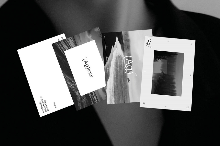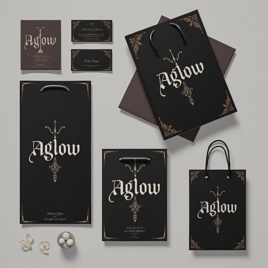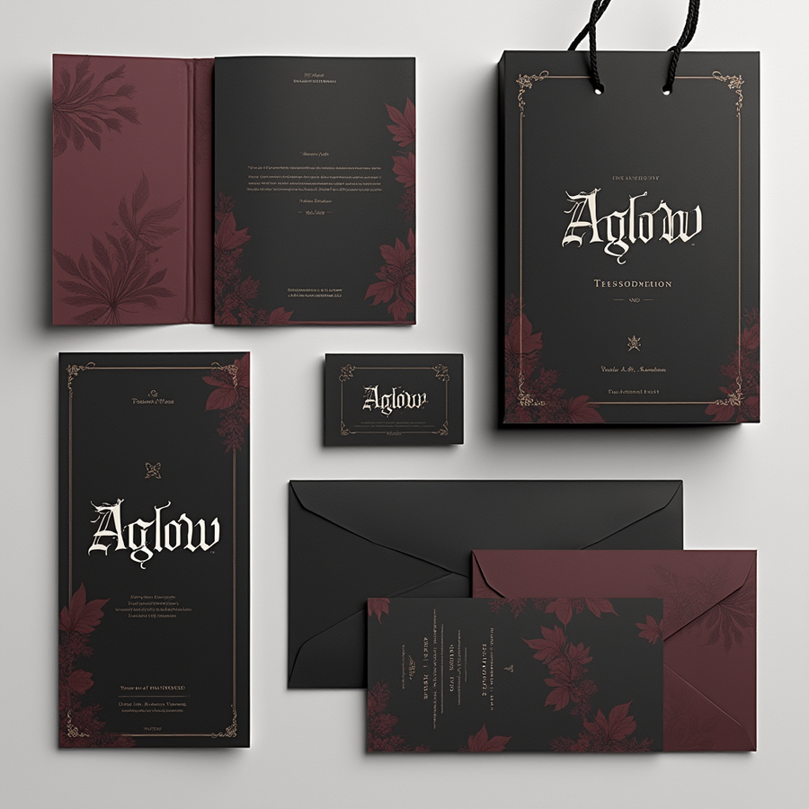 prompt: design showcasing multiple «Aglow» brand elements. Include a business card, a flyer, a gift bag, a booklet, black, white, gray or deep burgundy color palette, reflecting a Southern Gothic aesthetic. The «Aglow» logo (gothic lettering) should be consistent in design on all elements. High resolution.