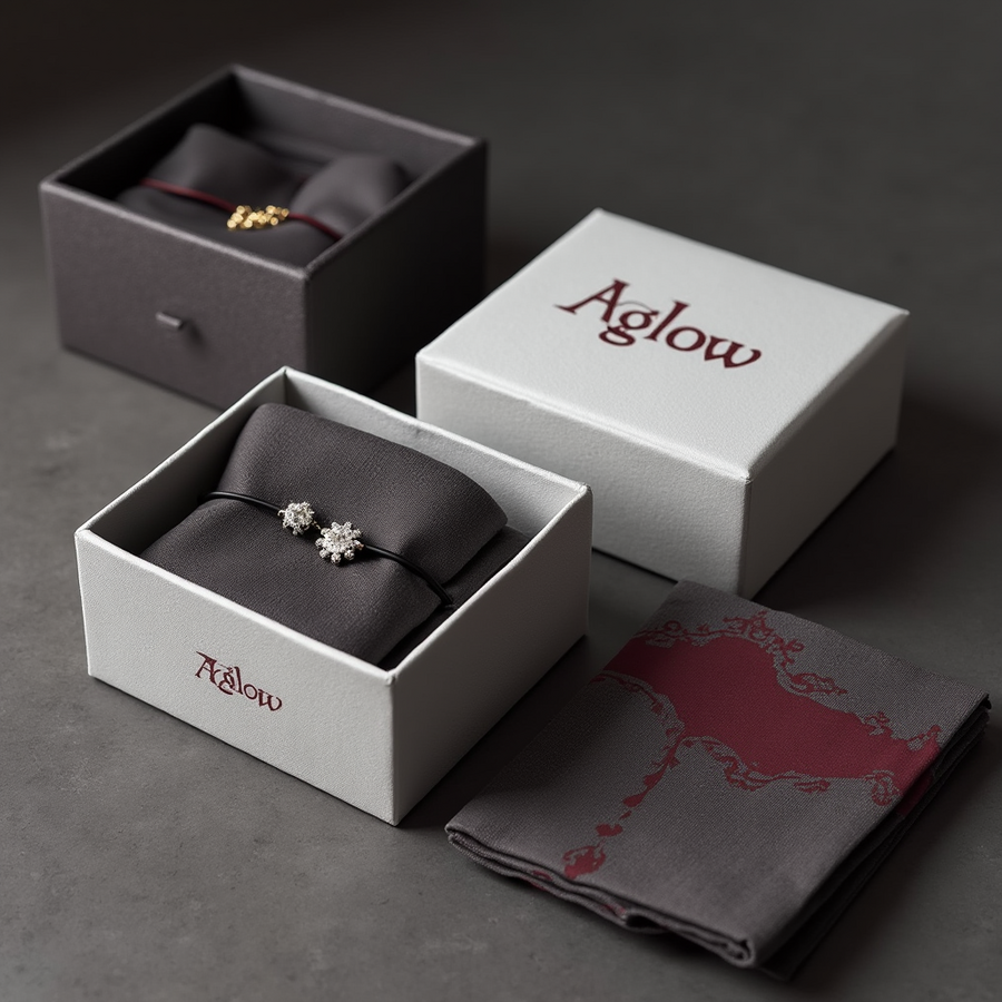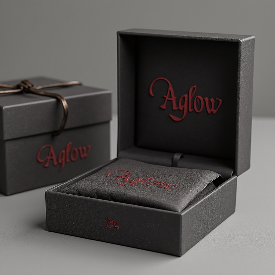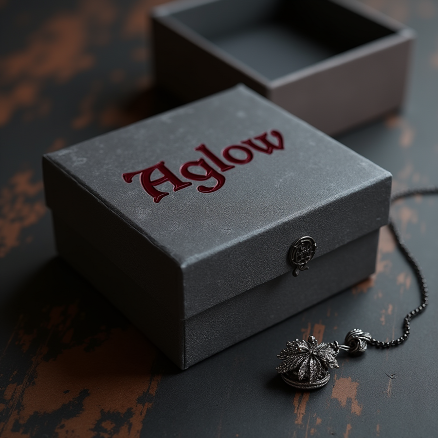 prompt: set of packaging for «Aglow» jewelry in a Southern Gothic style. The box is a deep gray or light gray, with a burgundy «Aglow» logo (gothic lettering) embossed on the lid. The box design should have a slightly aged or distressed look. High resolution.