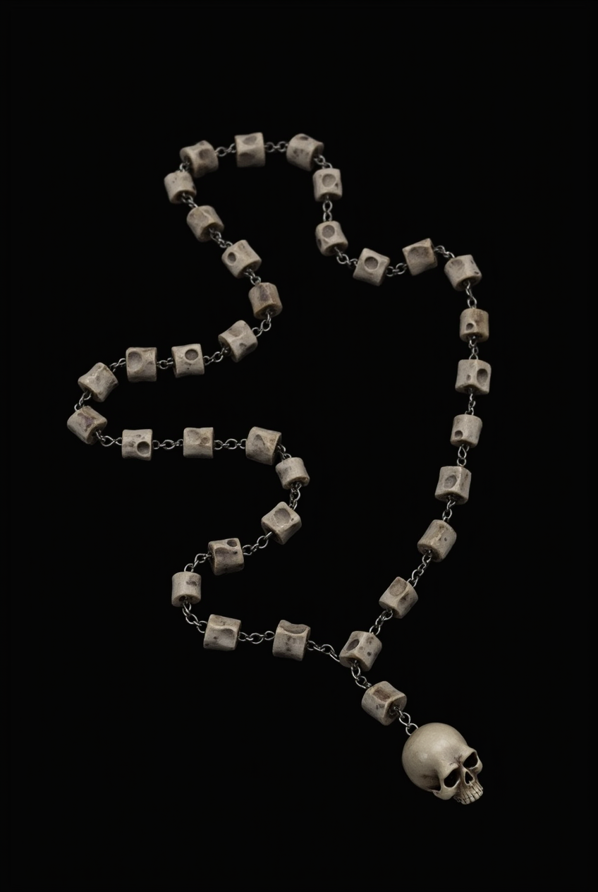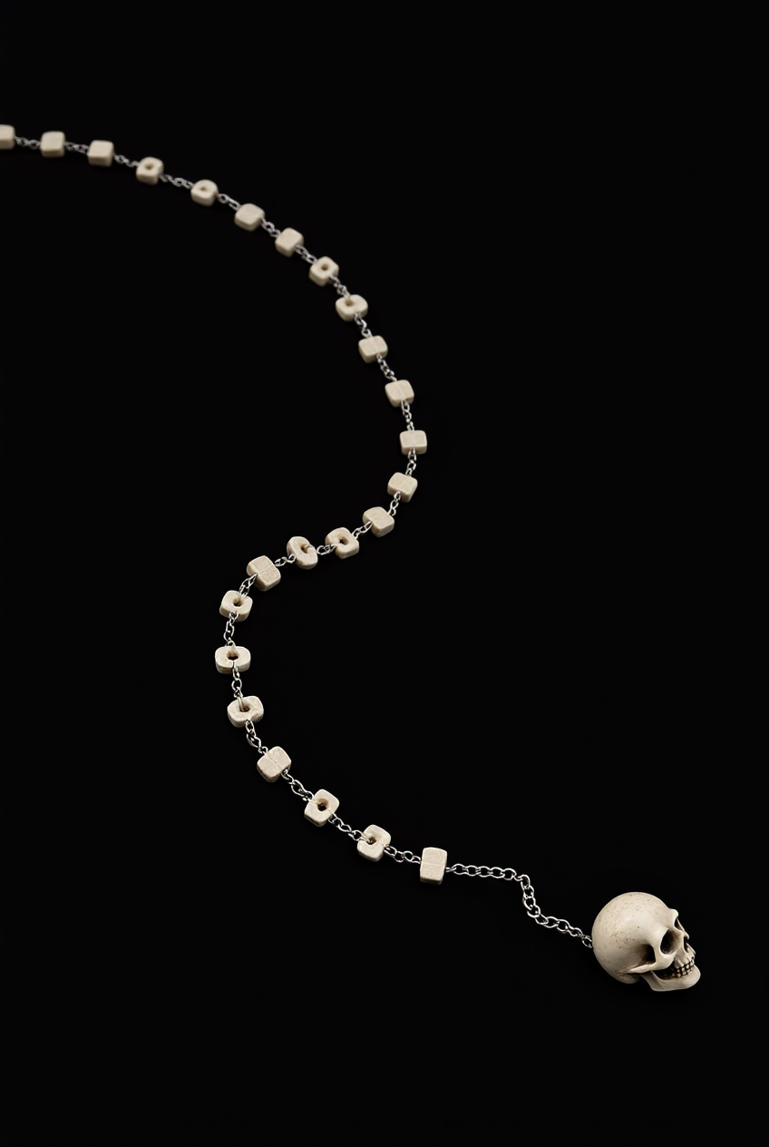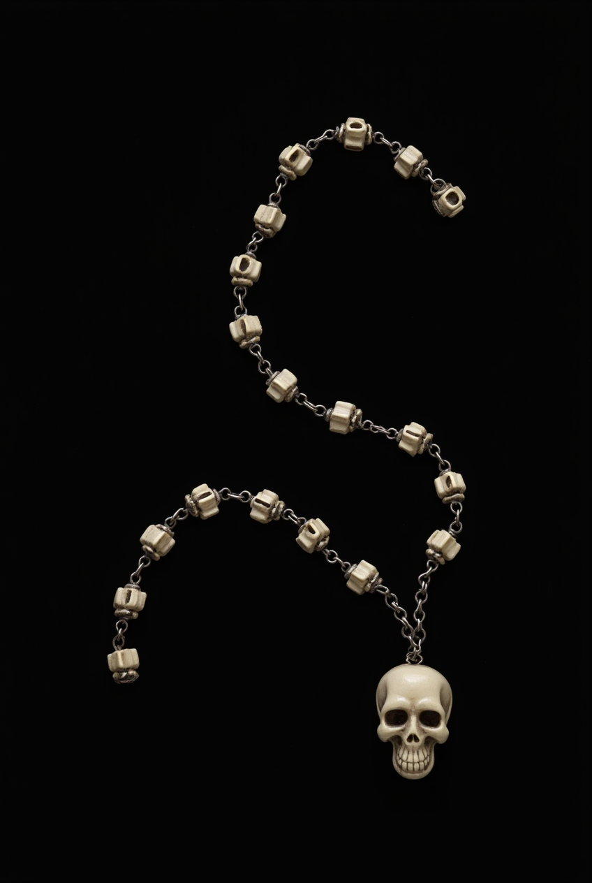 prompt: necklace with a skull pendant is made up of small, round, silver beads that are arranged in a chain-like pattern. The skull pendants are attached to the chain. The background is completely black. High resolution.