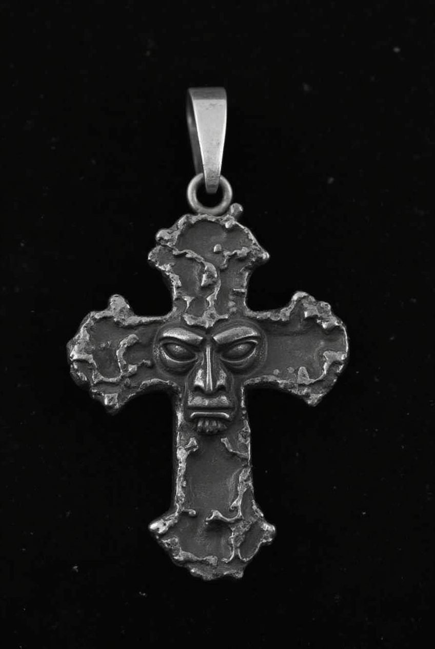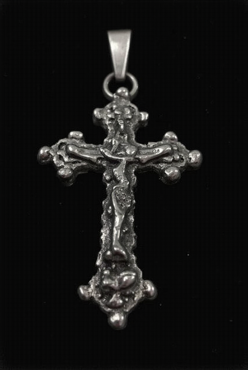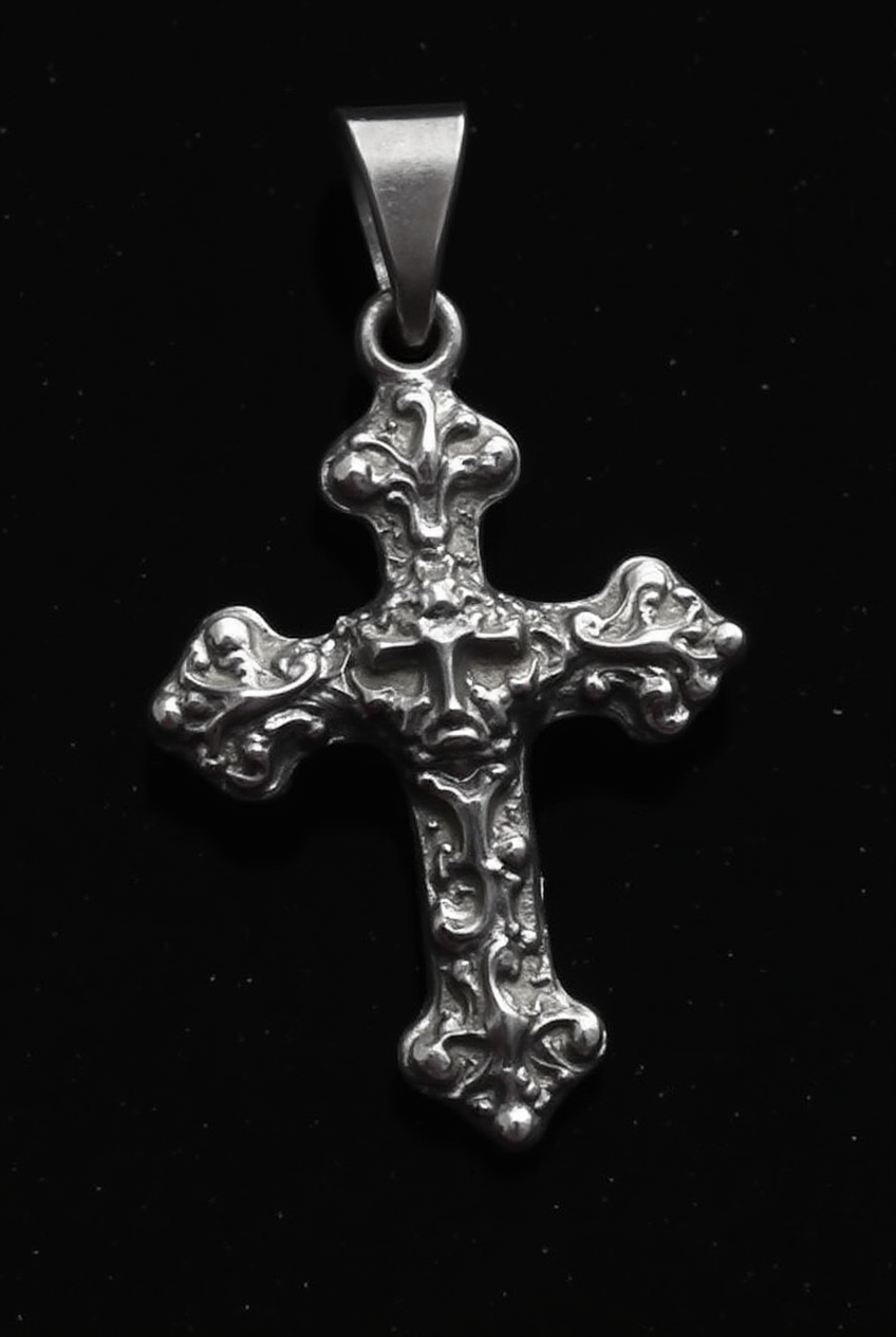 prompt: close-up of a silver cross pendant made of a shiny, polished metal intricate design with swirls and curves. The background is black. High resolution. --sref