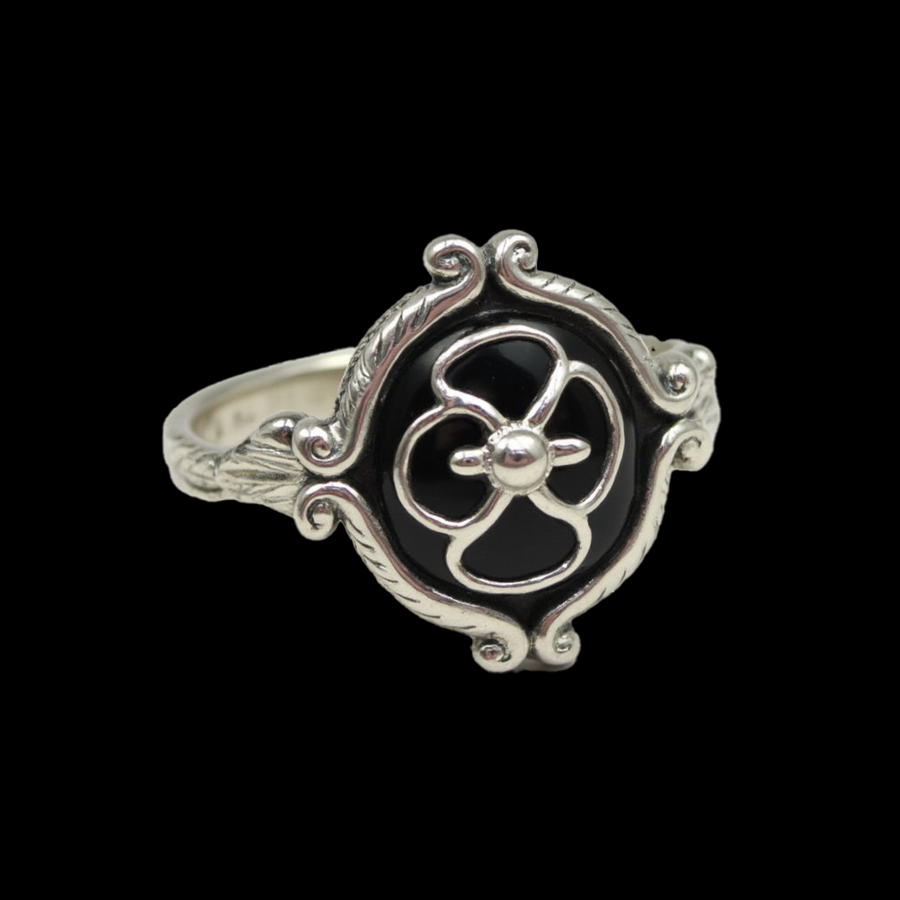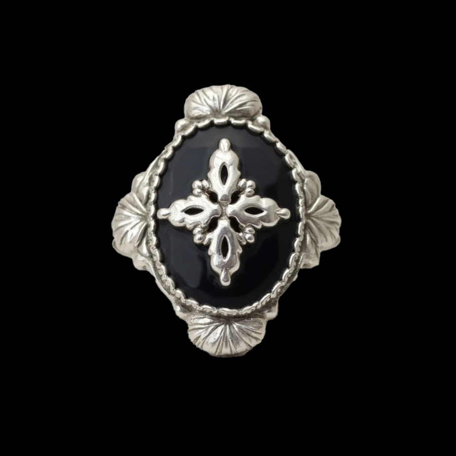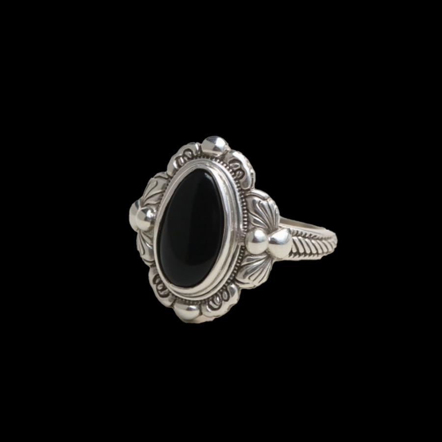 prompt: close-up of a silver ring with a black stone in the center. The ring is made of silver and has an ornate, filigree-like pattern around the edges in a Southern Gothic style. The background is completely black. High resolution.