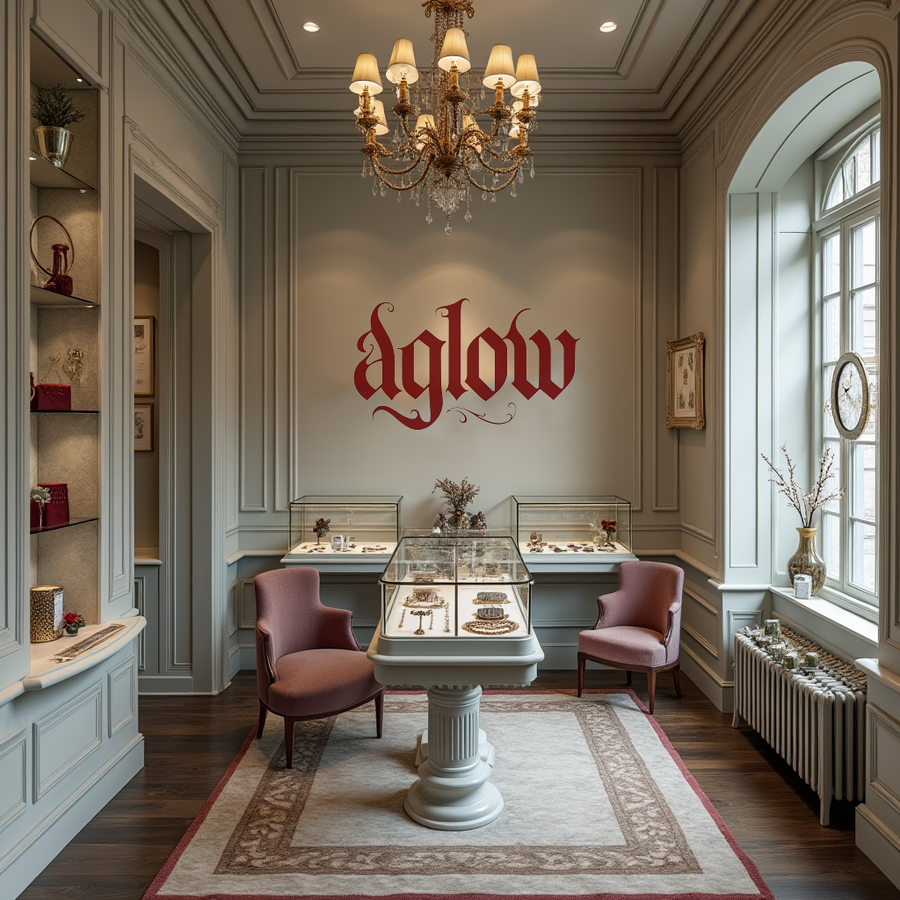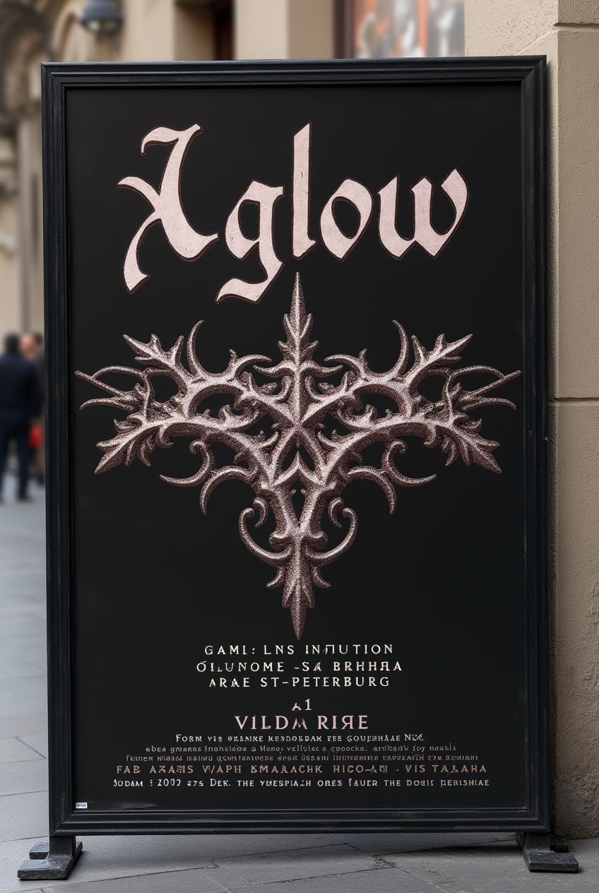 [1] prompt: mockup on the street of poster for «Aglow» jewelry in a Southern Gothic style, dark background, possibly a slightly distressed, the «Aglow» logo (gothic lettering) is large and prominent on each poster in a dark burgundy or mauve color, small typography provides the event information. Include decorative frames around poster. High resolution.