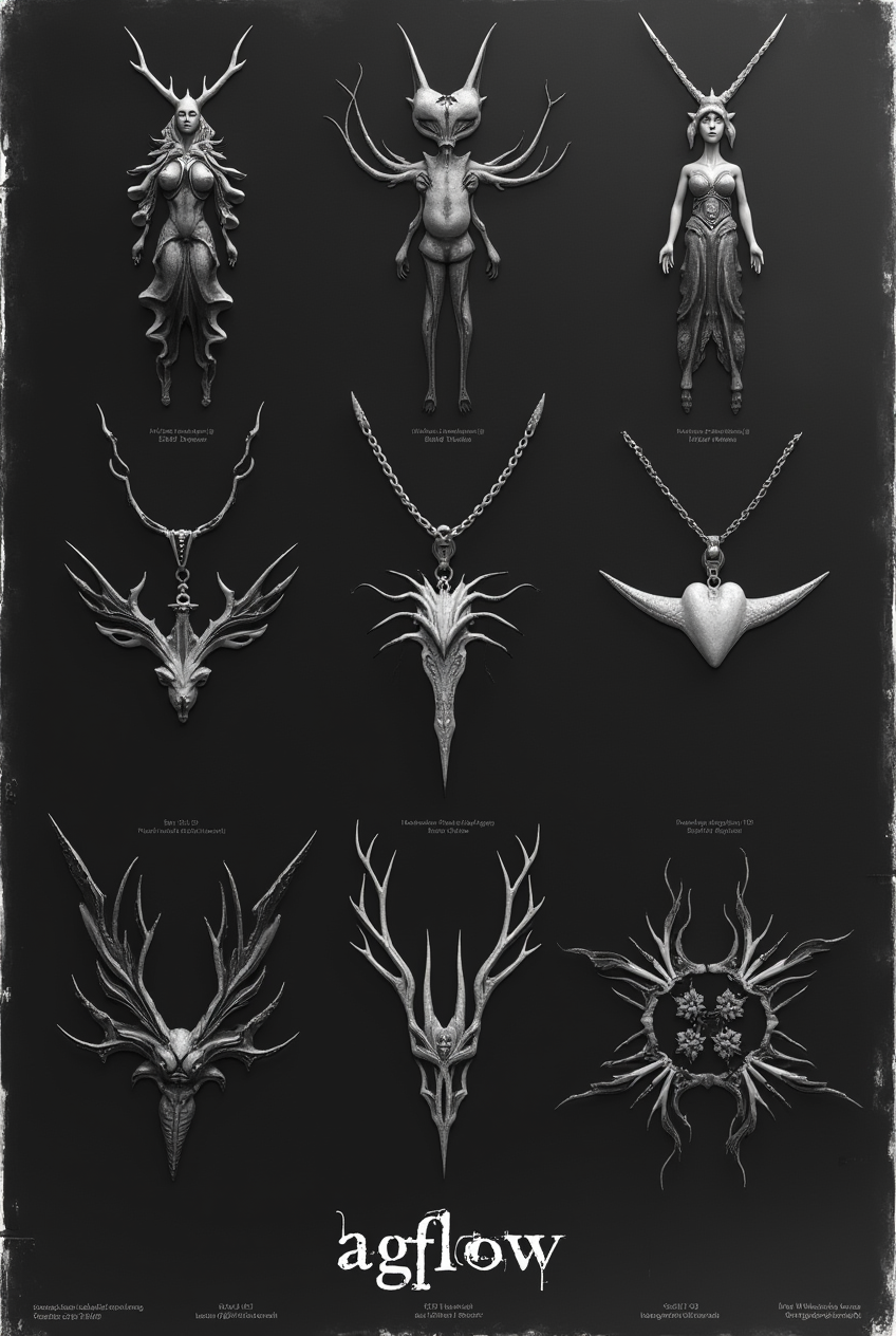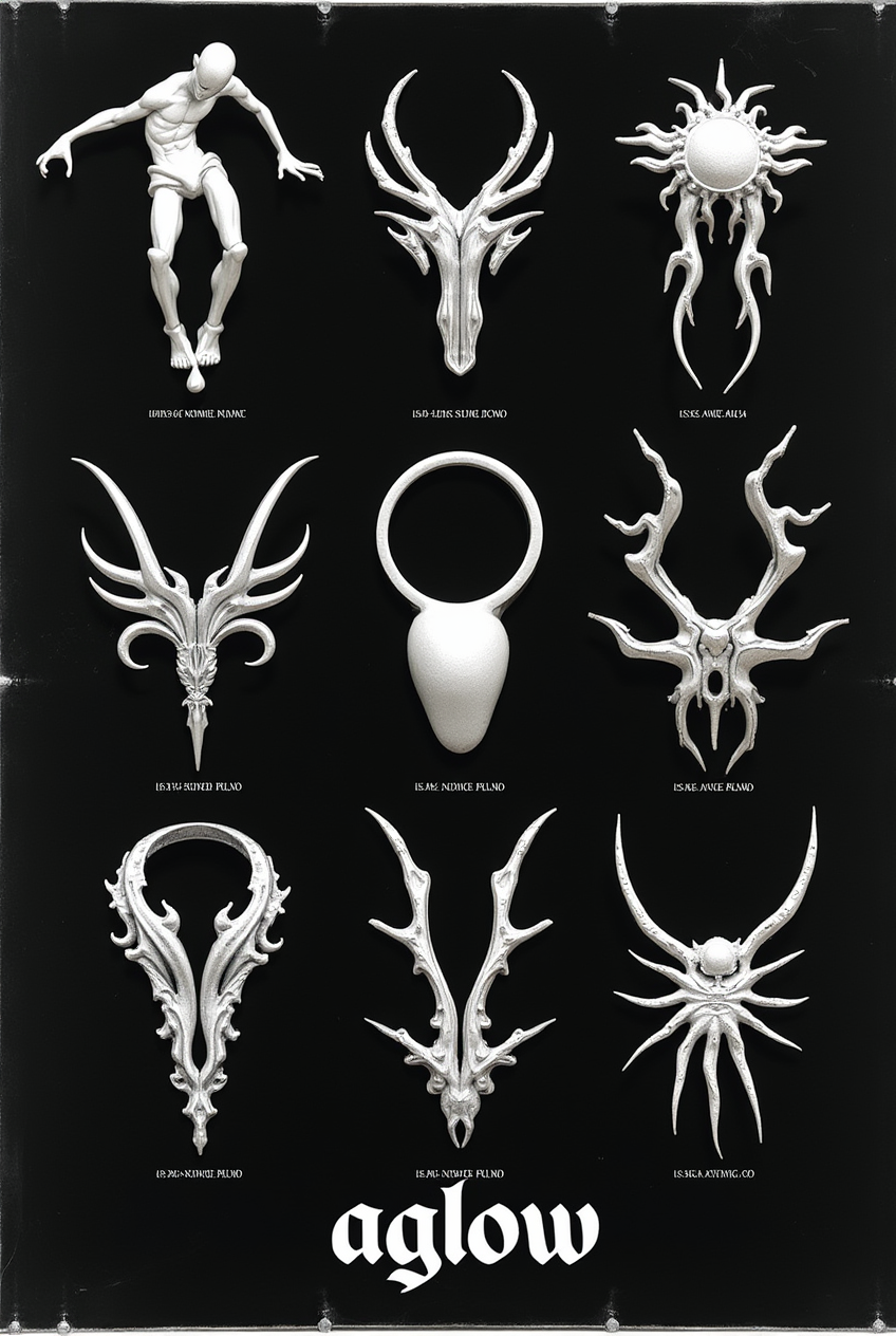 prompt: poster with collection of pendants from the brand Agflow. The pendants are arranged in a grid-like pattern on a white background with brand name «aglow» (gothic lettering) and name of new collection on the top. High resolution. --sref