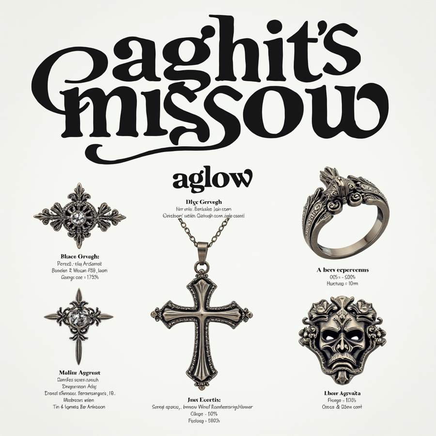 [2, 3] prompt: poster for «Aglow» jewelry in a Southern Gothic style, dark background, possibly a slightly distressed, the «Aglow» logo (gothic lettering) is large and prominent on each poster in a dark burgundy or mauve color, small typography provides the event information. Include decorative frames around poster. High resolution.