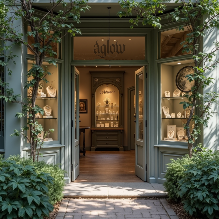 [1] prompt: view of the entrance to a small, inviting jewelry store in a Southern Gothic style, natural light filters through a entryway, the walls are a light gray, with subtle, ornate details like wood trim, jewelry displays are visible through the doorway. High resolution.