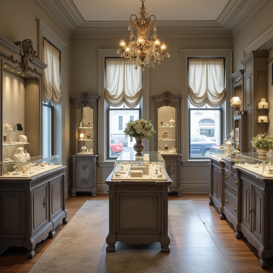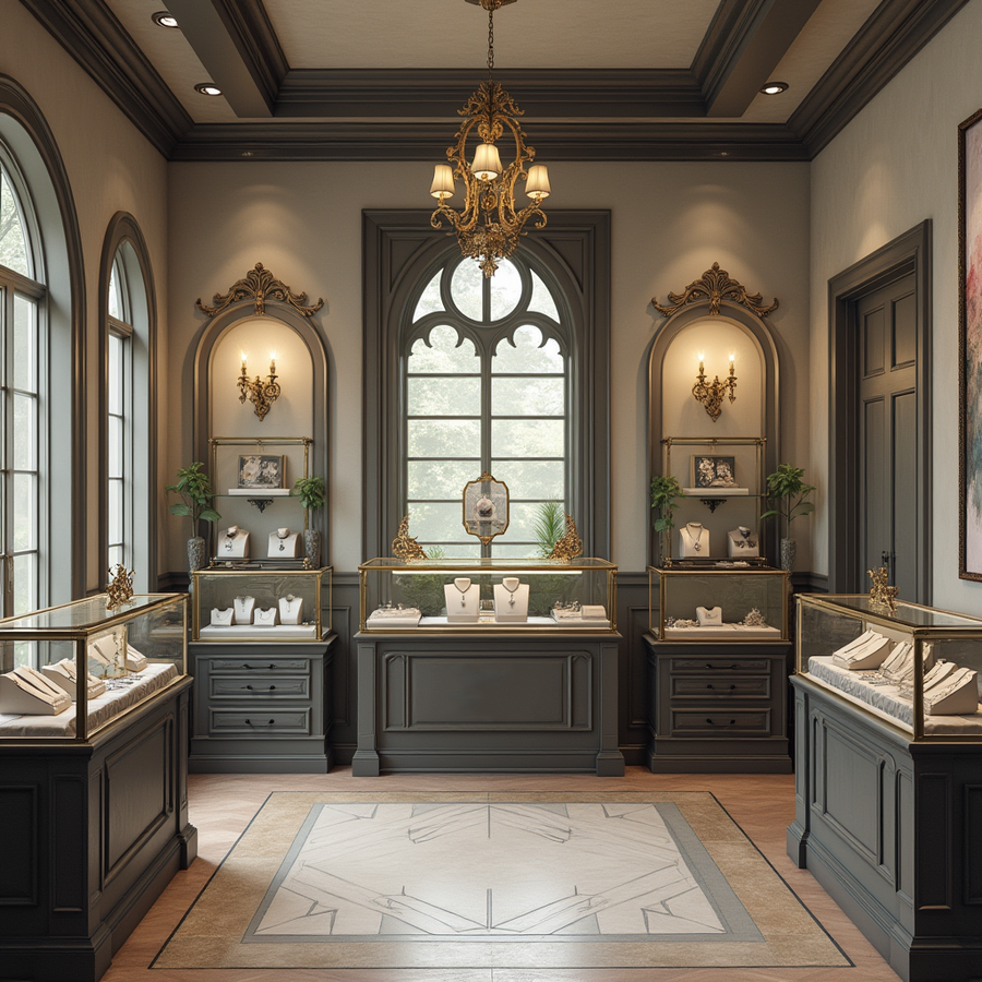 [2, 3, 4] prompt: small, inviting jewelry store in a Southern Gothic style. The store is well-lit, with natural light filtering in. Walls are light gray, with subtle, ornate details like wooden trim. The overall aesthetic is refined and comfortable, but with a touch of dark romanticism. Include jewelry displays, counters, and fixtures. High resolution.