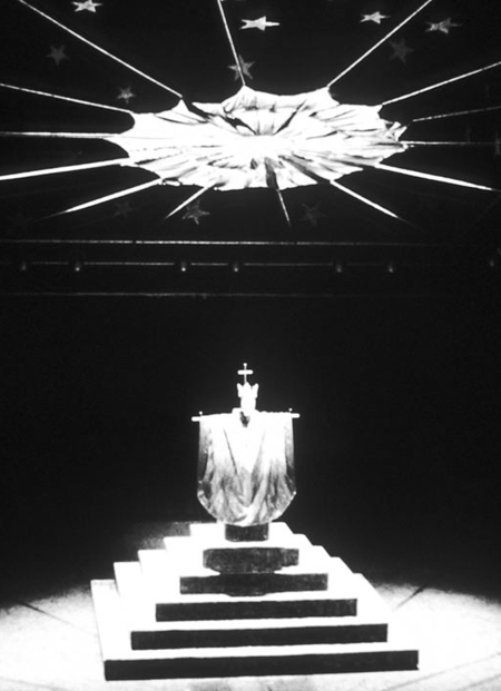 Многими критиками также было отмечено «сияние, подобное солнечному» (7), озаряющее фигуру Гамлета. В этом случае свет работал не только «нимбом», символом-выделителем, — он будто ослеплял героя, передавая его трагическую, но абсолютно недостижимую близость к миру счастья и душевного покоя.