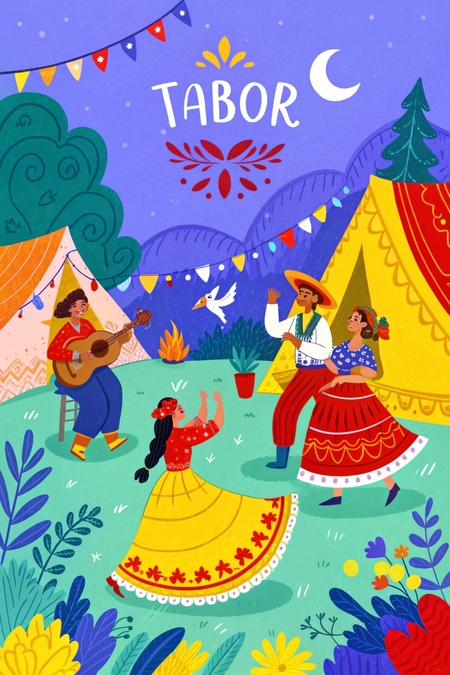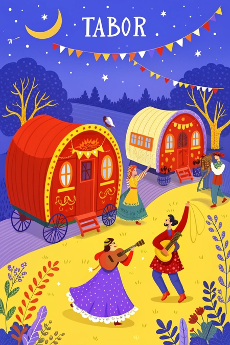 Prompt: Illustration for the poster of the festival of Gypsy, romany culture «Tabor».