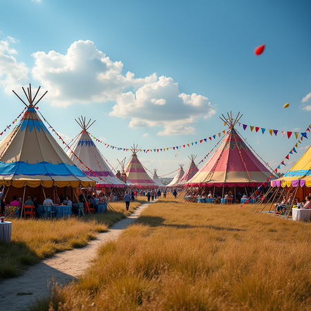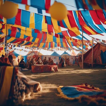 Prompt: picture the location: a tented gypsy festival in the middle of the steppes. Everything around is bright and colorful, in blue-red-yellow shades.The site is adorned with colorful decorations, including banners and flags that represent the gypsy heritage