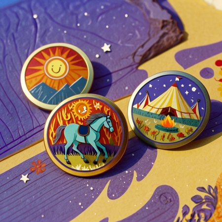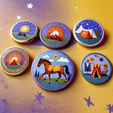 Prompt: Metal badges with illustrative individual images of a horse, sun, wheel, tents, bonfire.