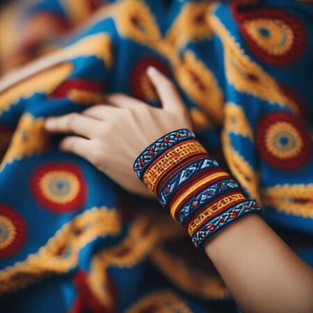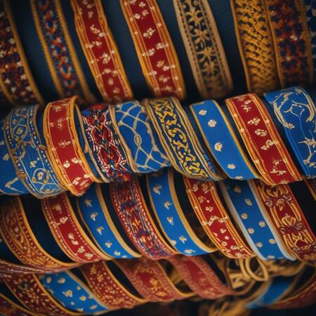 Prompt: A photo of a stack of rubber bracelets with a blue-red-yellow gypsy pattern on a woman’s arm.