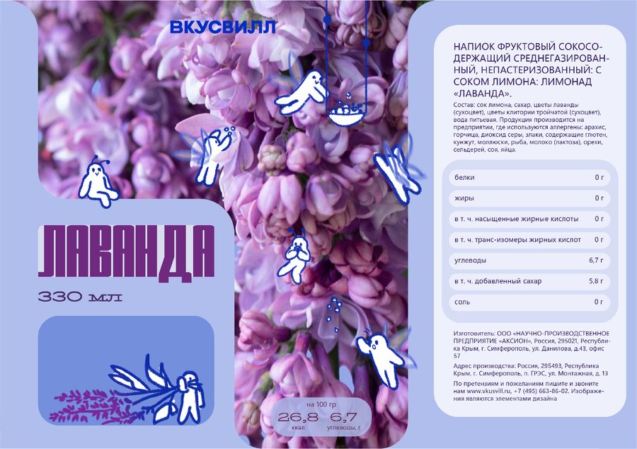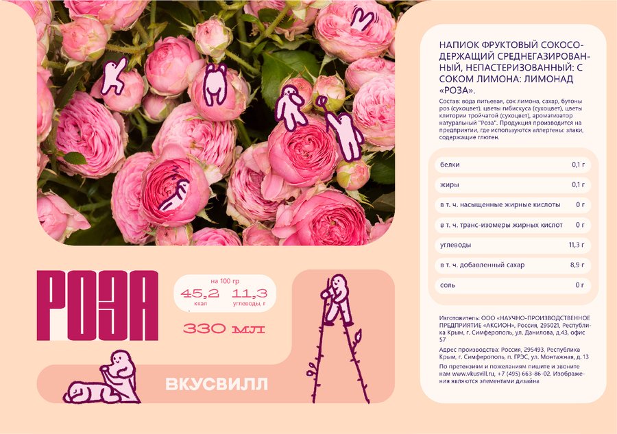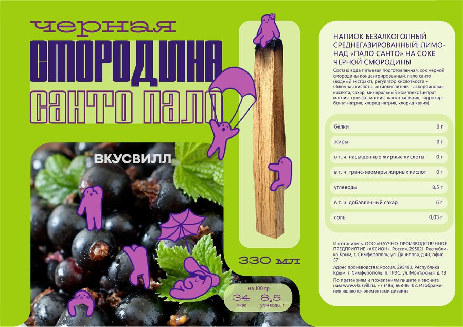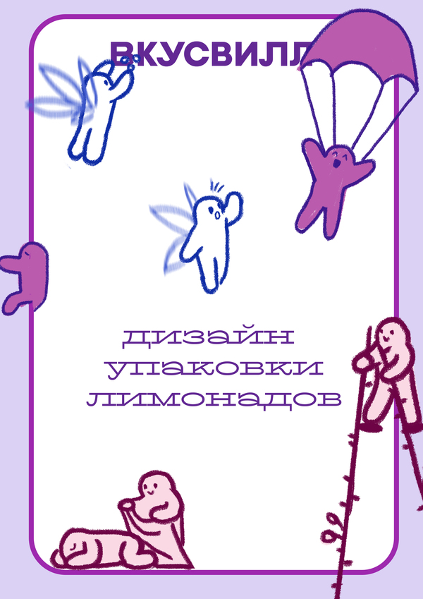 Задача стояла создать понятный и креативный дизайн. Главная идея дизайна-создание «особого мирка» лимонада. Дизайн направлен вызывать добрые эмоции и привязанность по отношению к продукту, т. к. у этикеток есть лицо-это живые человечки (вкусвиллики). Эти вкусвиллики живут как внутри фото, так выходят за его рамки- все ради создания вкусного лимонада. Композиция основана на «бенто» стилистике с использованием нестандартных шрифтов.