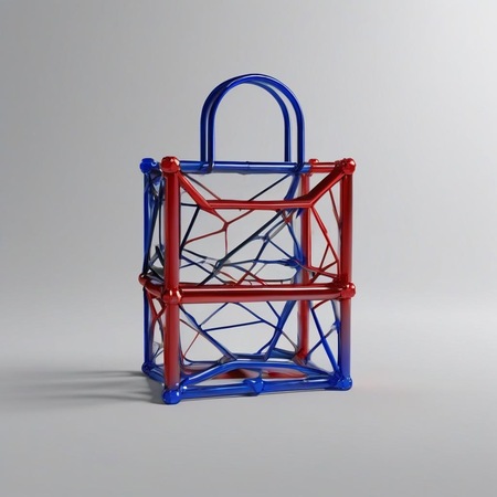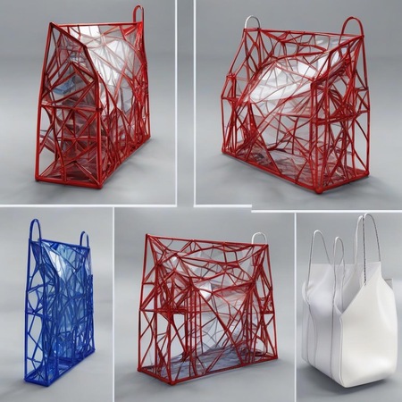 промт: generate a mockup of a bag for the «METATIAUN» showcasing their expertise in producing small and big architectural forms which is made of iron trusses and glass: colors: red, blue, white, black