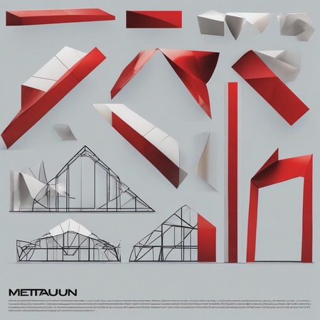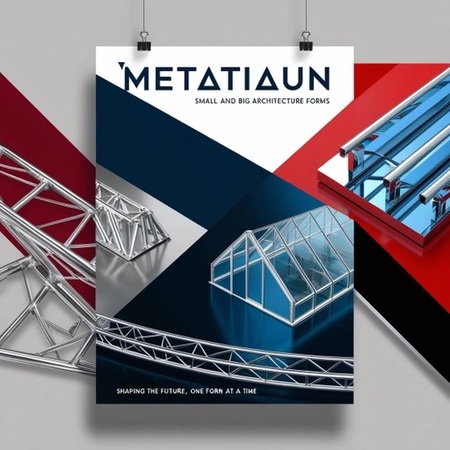 промт: a sleek and modern poster for «METATIAUN» showcasing their expertise in producing small and big architectural forms which is made of iron trusses and glass: red, blue, white, black