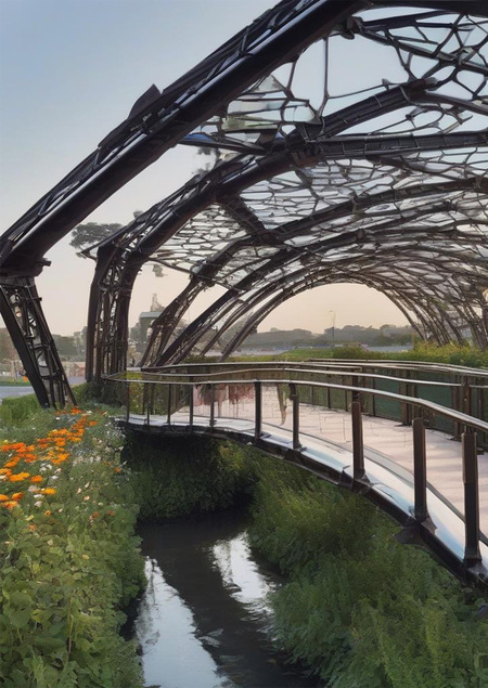 промт: a pedestrian bridge which is made of iron trusses and glass and which goes over the road