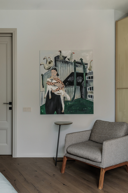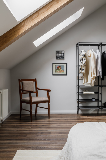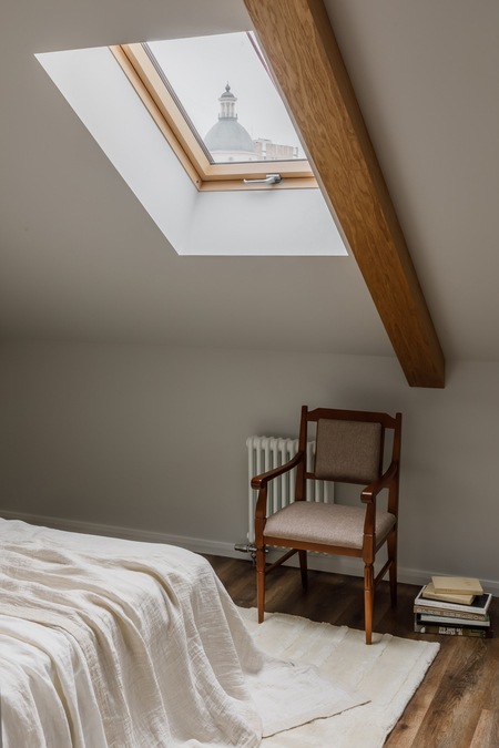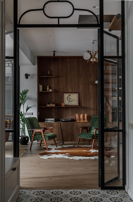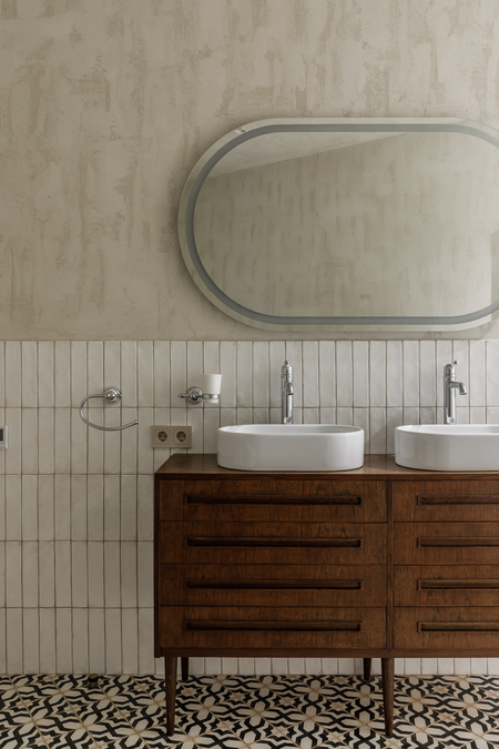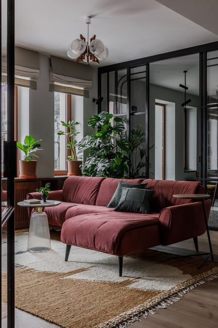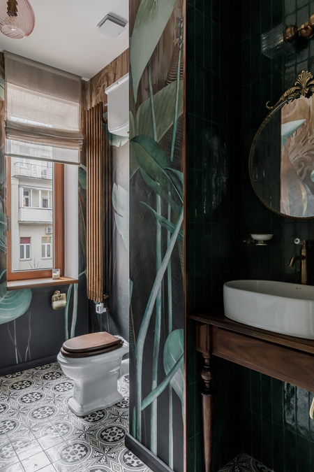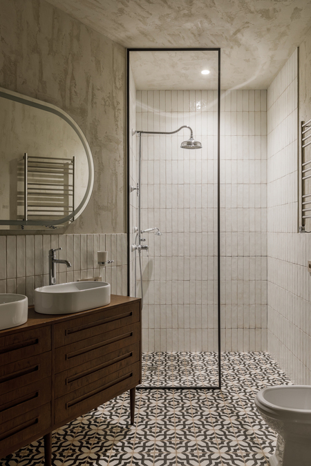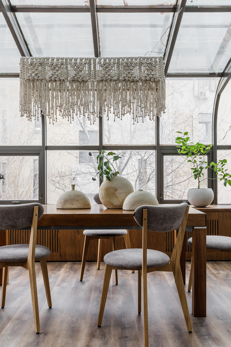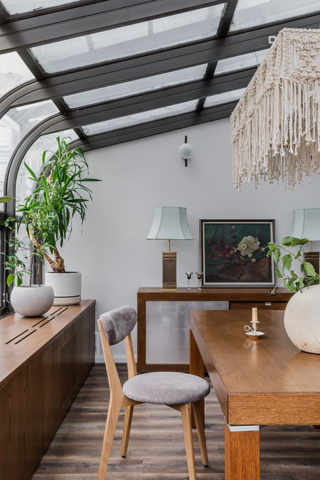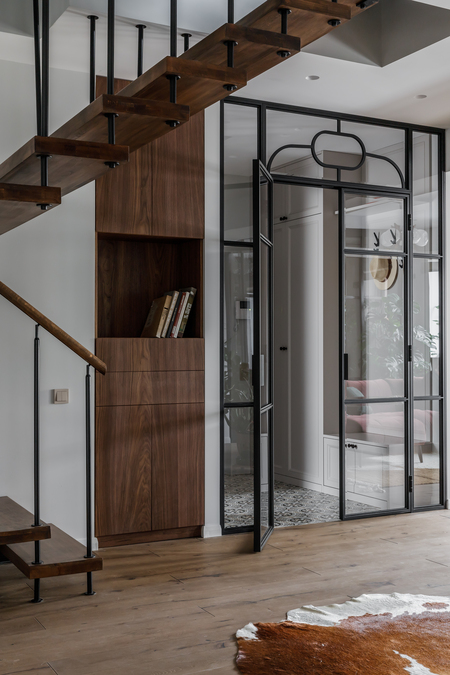 Varya Shalito and Rada Kobuk designed an apartment with an attic floor and a large glazed loggia in the historical center of Moscow. The owner of the apartment loves to travel, so she wanted to combine the motifs from her journeys: Portugal with its elegant hand-made ceramics, London with its textures and fabrics, as well as her own vintage furniture. As a result of a partial redevelopment, the authors of the project changed the line of the walls, got rid of non-functional dark corners and skillfully zoned the space. The first floor houses a large living room, kitchen and dining area, master bedroom with bathroom, dressing room and office.