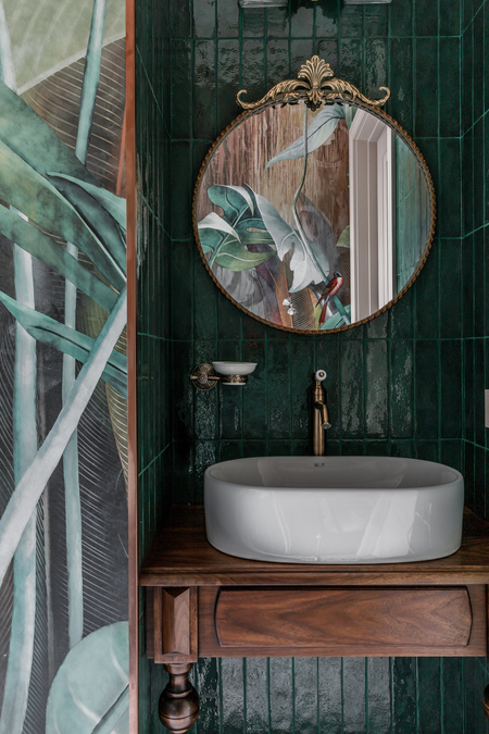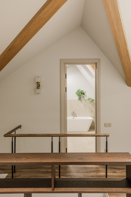 On the second floor there are two children’s bedrooms, a bathroom with a shower and a bath, a dressing room and a room for rest and sports. The palette of the first floor is as colorful as possible: the mixture of shades of juicy greenery and Portuguese ornaments. And in contrary, the attic floor is visually made light and bright, combining with wood, beams and furniture.