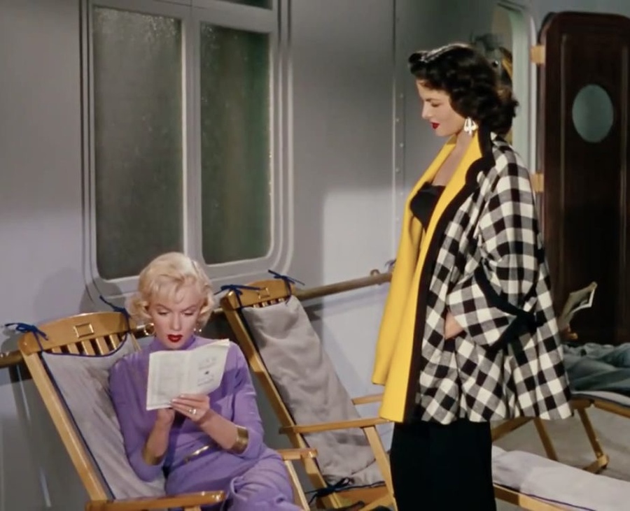 Начать хочется с иконического выхода Джейн Расселл (Дороти Шо) и Мэрилин Монро (Лорелей Ли) — контрасные образы актрис, дополняющие друг друга, не только подчеркивали их фигуры и отражали моду того времени, но и помогали понять характеры героинь в фильме. Мэрилин одета в оранжевое платье без бретелек в стиле русалки, с лифом с блестками и палантином. Это в паре с золотыми ремешками на каблуках. Ее аксессуары включают в себя бриллиантовые украшения и сверкающий золотой клатч. Джейн Расселл облачена в темно-синее платье с пайетками, которое создавало образ элегантной, и немного таинственной женщины. В отличие от ярких, почти игривых образов Мэрилин Монро, этот костюм представлял бы более зрелую и утонченную женственность.