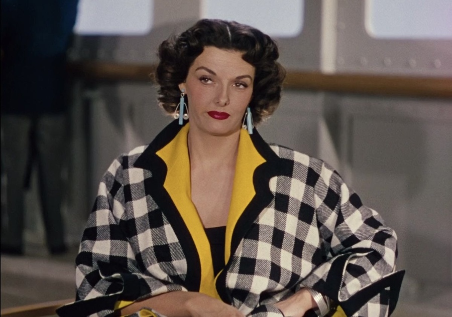 Последним проанализированным образом в фильме стал костюм Джейн Расселл. Героиня появляется в брюках, клетчатом жакете с желтыми вставками и черном топе с вырезом. Клетчатый узор жакета, был типичным для моды 1950-х, а жёлтые вставки были использованы в качестве контрастного акцента. Образ дополняли голубые серьги с причудливыми серебряными формами. В целом, костюм представлял собой сдержанный образ, характерный для моды того времени. Он отражал стремление к практичности и элегантности одновременно.