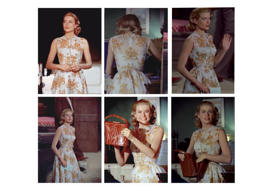 Следующий образ героини Грейс Келли (Лизы Фремонт) стало нежное летнее платье с цветочным «фарфоровым» узором. Платье имеет воротник под горло и пышную юбку. Цвет костюмов героини не носили случайный характер, все было продумано заранее. Так, например, Хичкок хотел, чтобы в своем появлении муслиновом платье, героиня была бы похожа на чашку саксонского фарфора: «хрупкую, такую, которую страшно взять в руки…». Это платье было разработано специально, чтобы усилить женственность и нежность героини, когда она врывается в квартиру человека, подозреваемого в убийстве жены.