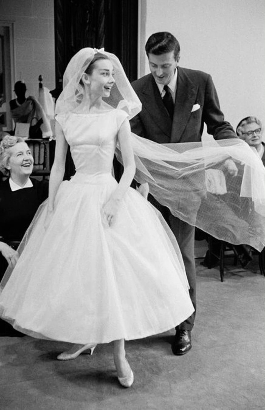 за кадром фильма «Забавная мордашка» (1957) (URL: The Most Iconic Movie Wedding Dresses of All Time) Просмотрено: 20.11.2024