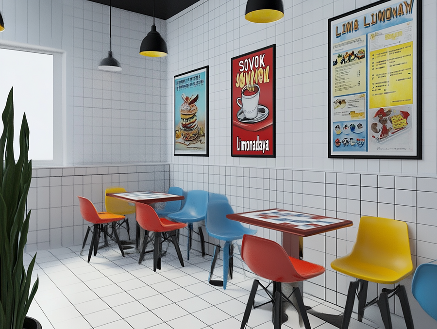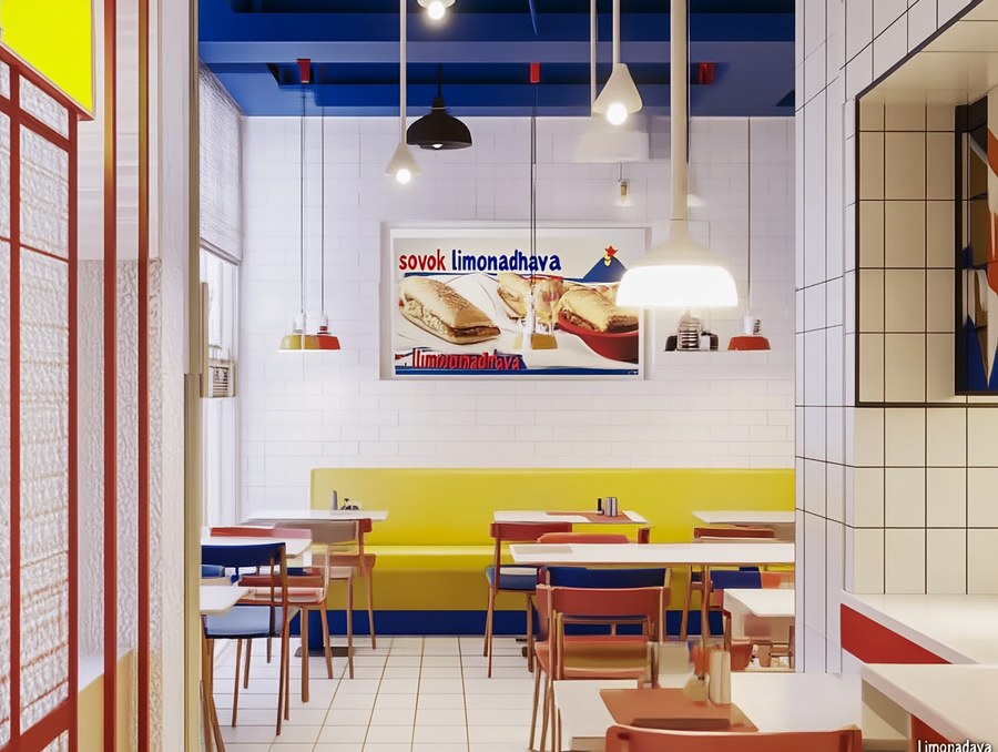 generata a soviet dining room cafe with blue red and yellow color and posters with «sovok limonadnaya» in suprematism style. White walls white tile --ar 4:3 --style raw --stylize 0 --v 6.1