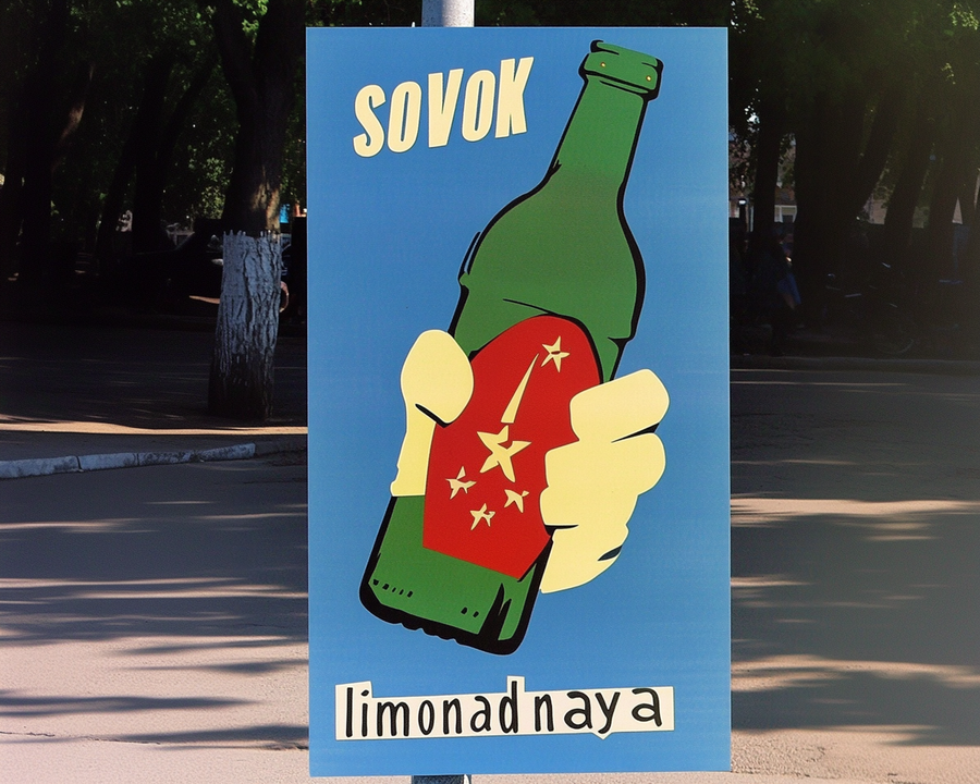Poster on street in soviet package style «sovok limonadnaya». Red blue yellow colors. --ar 3:4 --style raw --stylize 0 --v 6.1 https://s.mj.run/CxMzhE-zpJM