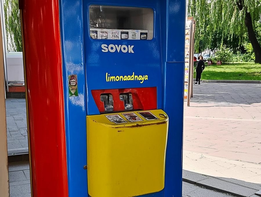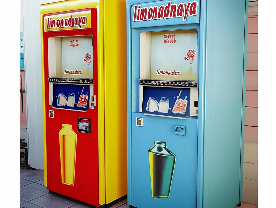 generate a vending soviet lemonade machine «sovok limonadnaya " Red yellow and blue colors --ar 4:3 --style raw --stylize 0 --v 6.1 https://s.mj.run/q_oRC7ryQbs