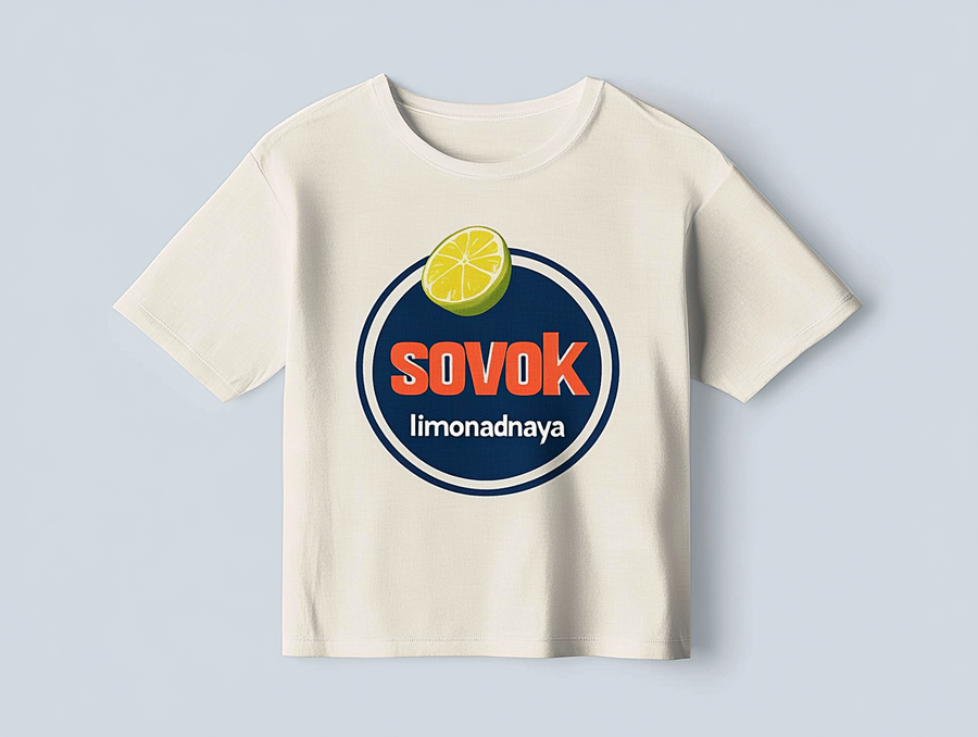 Hyperrealistic mockup of the one white t-shirt with «sovok limonadnaya» logo on the blue, ultra detailed, texture, natural lighting --ar 4:3 --style raw --stylize 0 --v 6.1