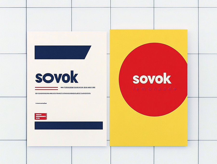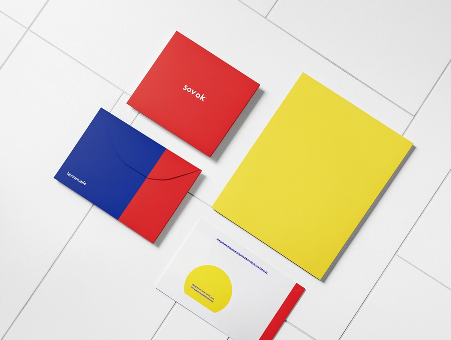 Stationaty mockup of printed materials in red yellow blue color palette (paper, envelope, business cards) on the white tile background for the «sovok lemonade» massage soda shop in modern design sovie