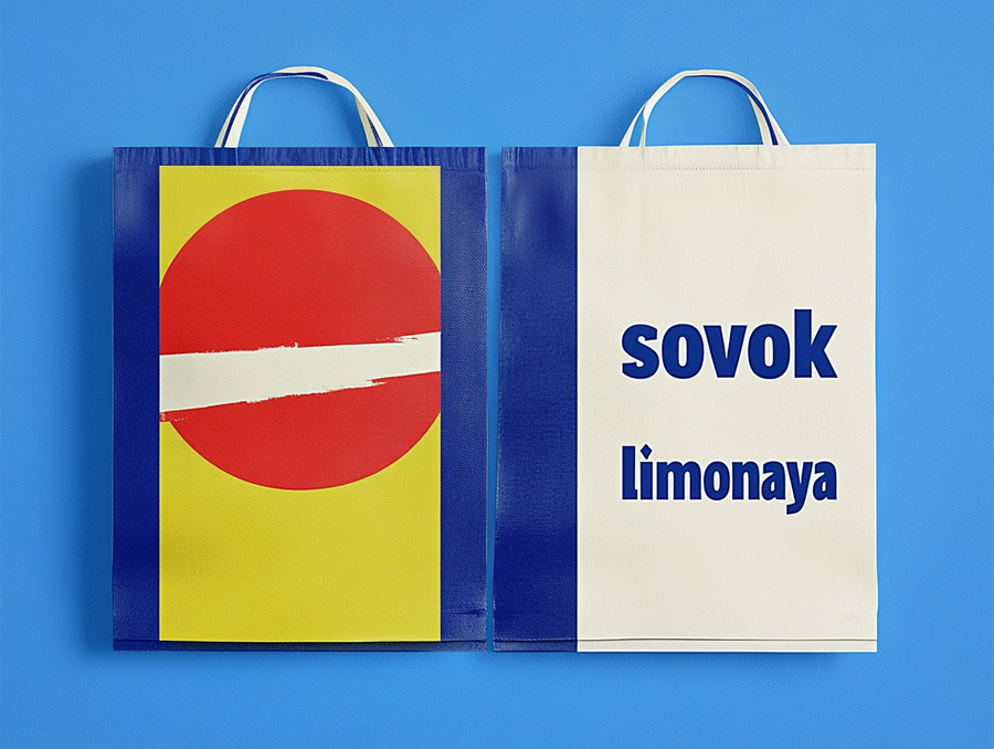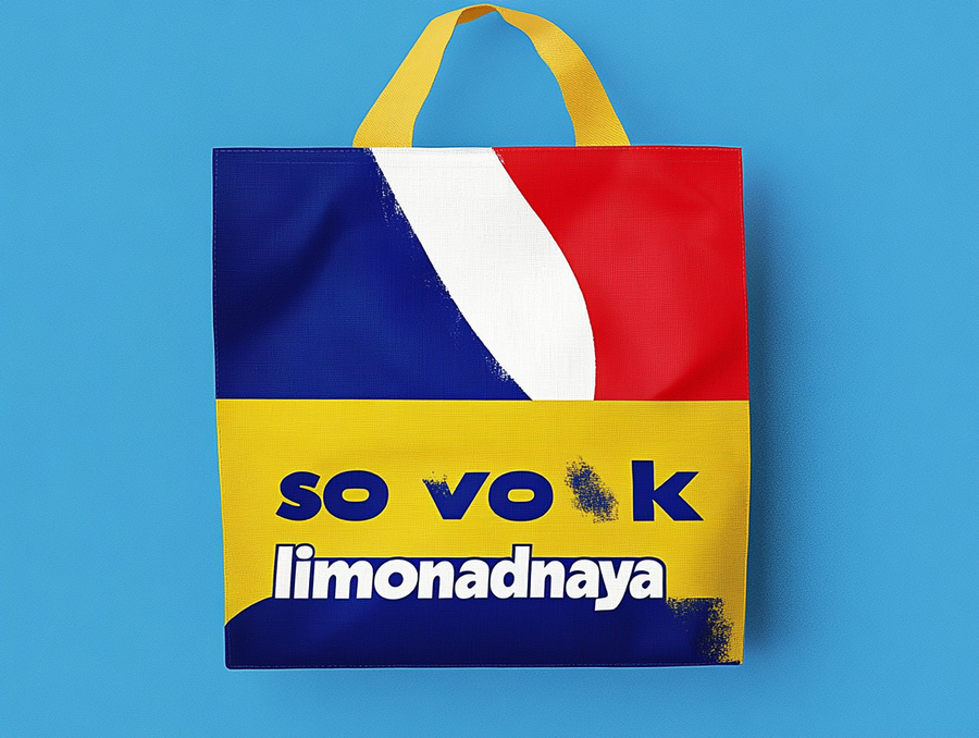 generata a bag mockup in soviet suprematism style blue back ground «sovok limonadnaya». Blue yellow and red color --ar 4:3 --style raw --stylize 0 --v 6.1