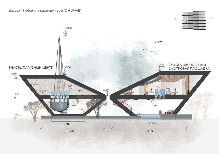 Здание становится символом вечного движения — стремления вперёд, которое характерно для яхтинга. Оно интегрируется в прибрежный ландшафт, создавая ощущение лёгкости, флюидности и непрерывного взаимодействия с морем. Открытая летняя веранда расположена на втором этаже. Первый этаж выделен под торговые зоны и ресторан.