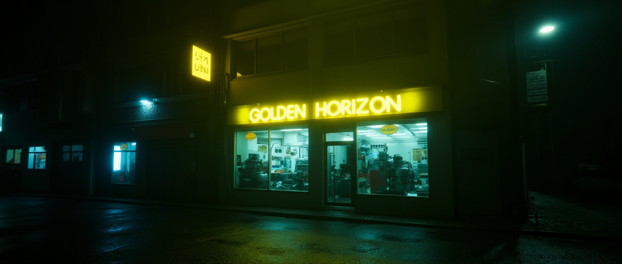 visualise a single-storey hyperpunk shop building for cookware brand Golden Horizon Housewares, set in an authoritarian beggar town. Accentuate the industrial strength with a limited colour palette of dirty yellow, neon blue, brown and green. Demonstrate the defeat of the city with broken blinds on the shop windows. Complete the atmosphere of the night city with yellow sky and dirty rainy and wet street and neon sign ‘Golden Horizon’. The typography of the lettering on the sign should suggest solidity and reliability