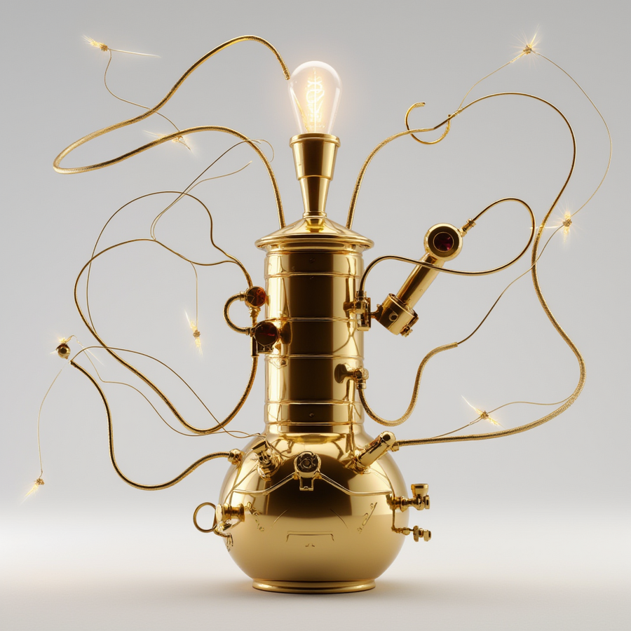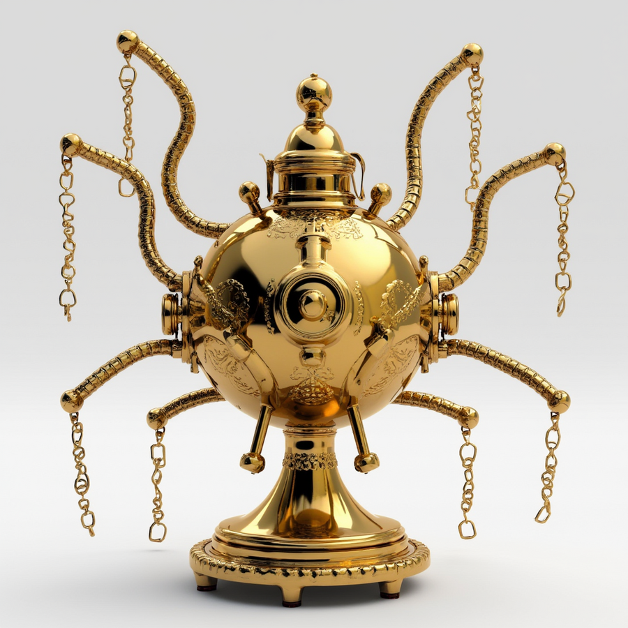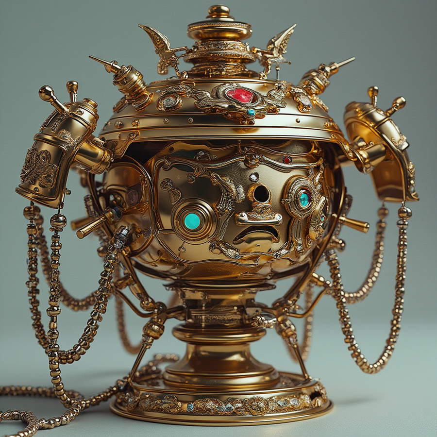 design a hyperpunk-inspired branded samovar with tubes, wires and bulbs coming out of the body. Accentuate the item’s durability and functionality with gold colour and lustre.