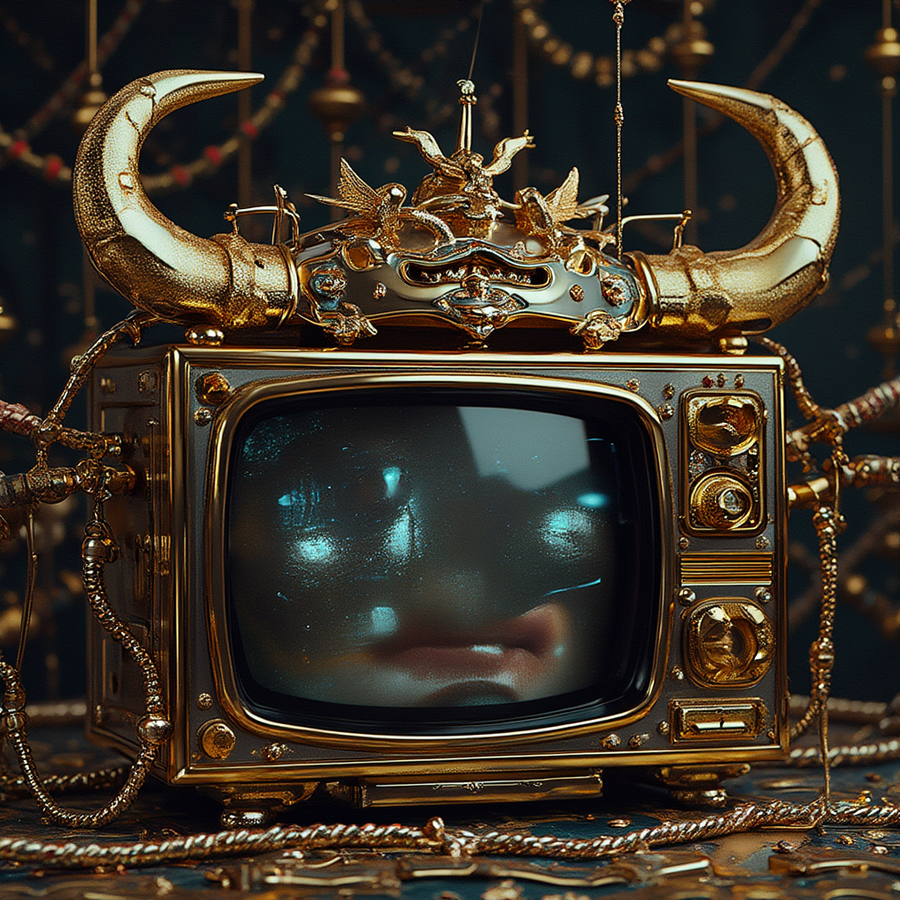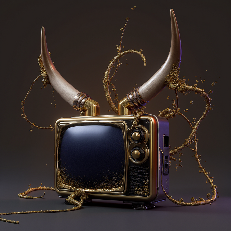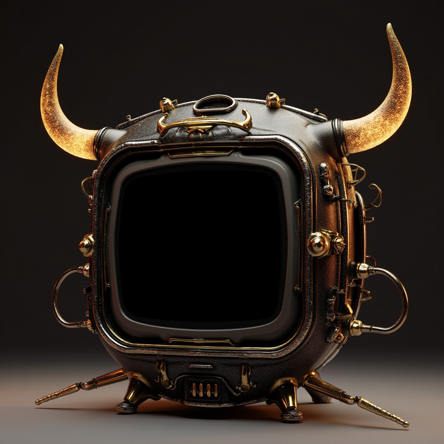 design a branded hyperpunk-style kinescope TV with wires in the shape of bull horns coming out of the case. Accentuate the durability and functionality of the horns with gold colour and glitter.