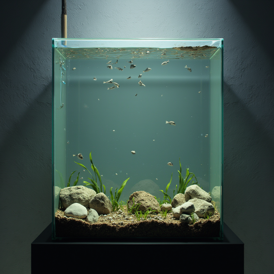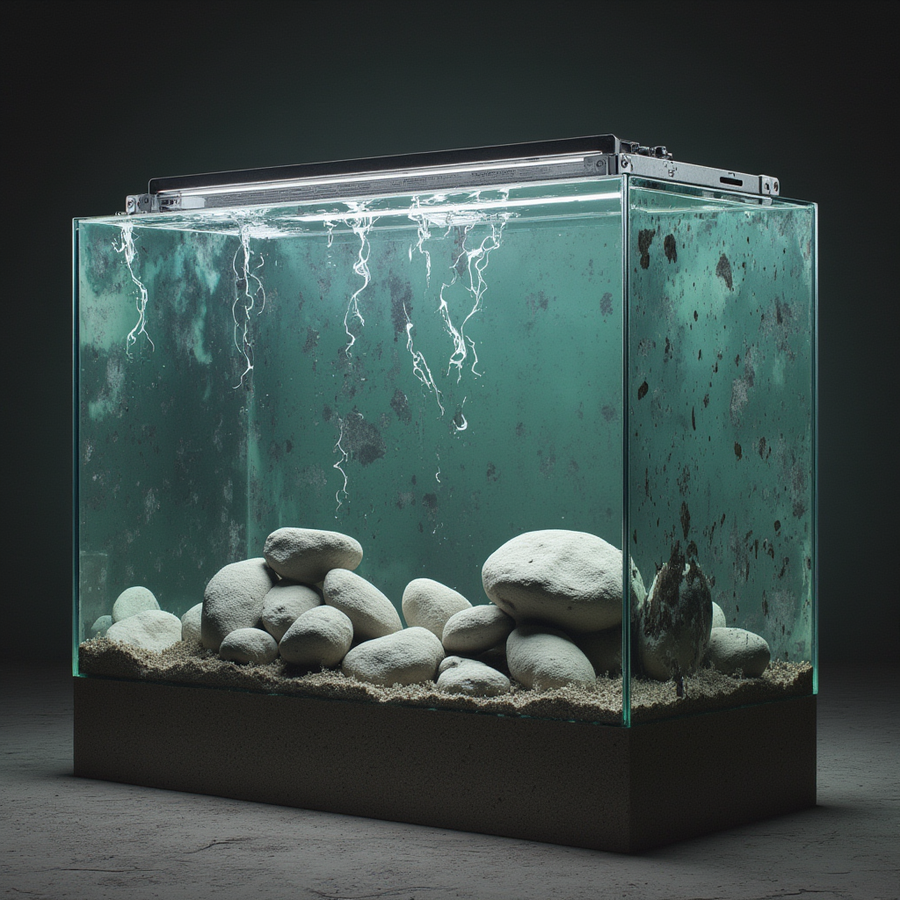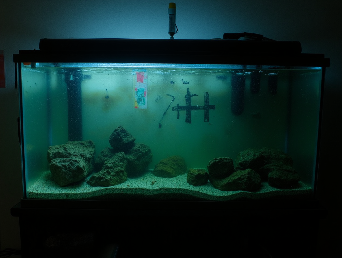 design a branded aquarium with rocks on the bottom in hyperpunk style. Emphasise the neglect of the aquarium with murky water inside and paper marks.