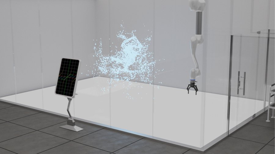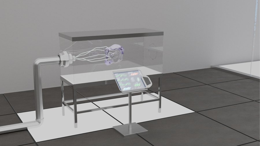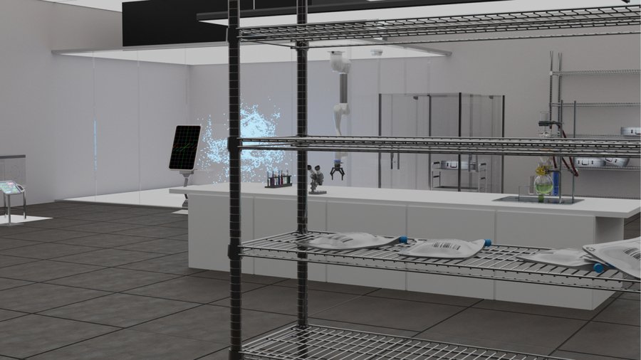 mj: 3d photorealistic rendering of cinema 4d scientific factory room, white walls, glass, metal, white lighting, glare, to large glass cubes are moving luminous particles of blue color