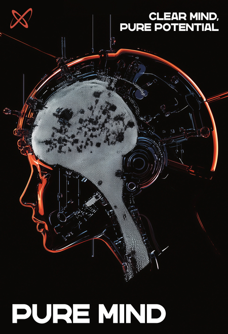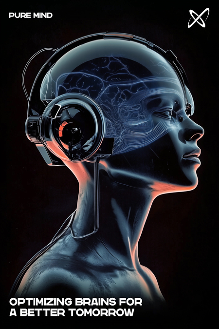 mj: create an advertising creative for a high-tech information processing center from the future. The startup aims to produce high-tech helmets to cleanse the brain of negative information. company called «Pure Mind», the name is written in nersans one regular font. The poster should have the following colors: 9AA1A6, 0C0A08, EAF0F2, C94C3C, E79F74