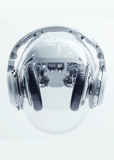 mj: A highly detailed 3D render in Cinema 4D of a futuristic, minimalistic, high-tech helmet. The helmet features sleek built-in headphones and an advanced transparent protective screen around it, showing off the intricate metal connectors with a matte finish inside. The helmet hangs in the air. The design is both streamlined and visually complex, striking a balance between futuristic elegance and high-tech sophistication. The lighting is crisp and clean, while subtle reflections emphasize the helmet’s ultra-modern material. The helmet turned slightly to the left. The backdrop is completely white and clean