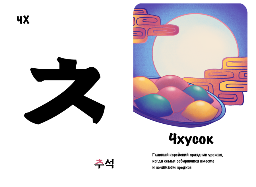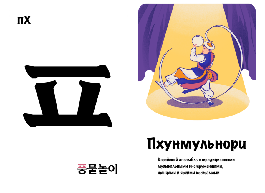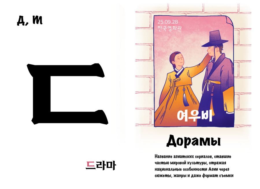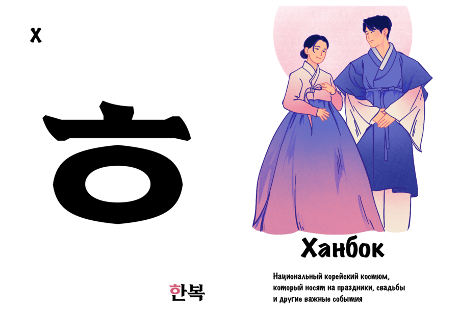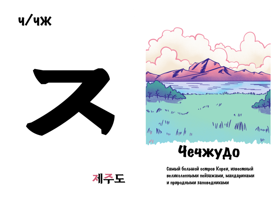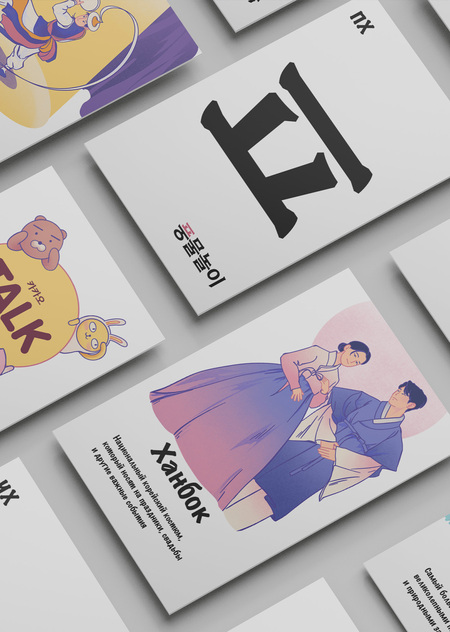 Проект «Культурный хангыль» нацелен на то, чтобы сделать изучение корейских согласных более интересным и полезным занятием. Он выполнен в виде двусторонних карточек, с одной стороны которых находится буква, а с другой — предмет / место или особенность, отсылающая к культуре Южной Кореи и начинающаяся на эту букву. Карточки станут хорошим дополнением к работе репетиторов и учителей корейского.