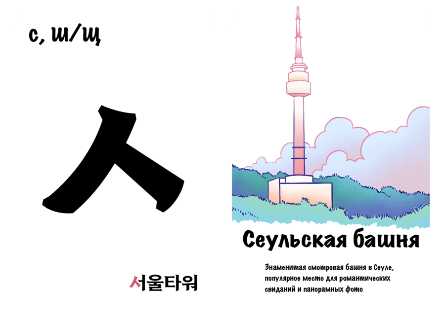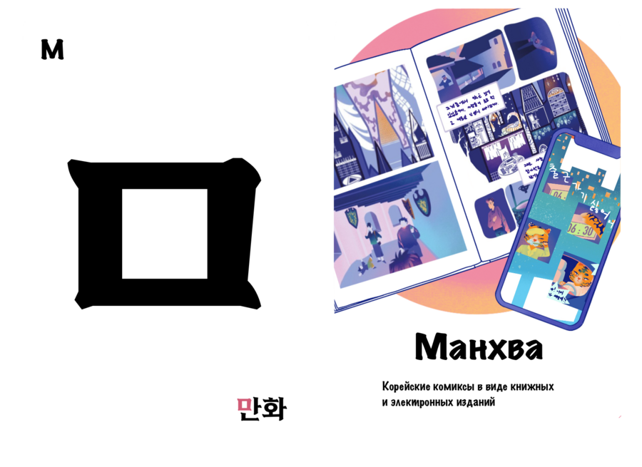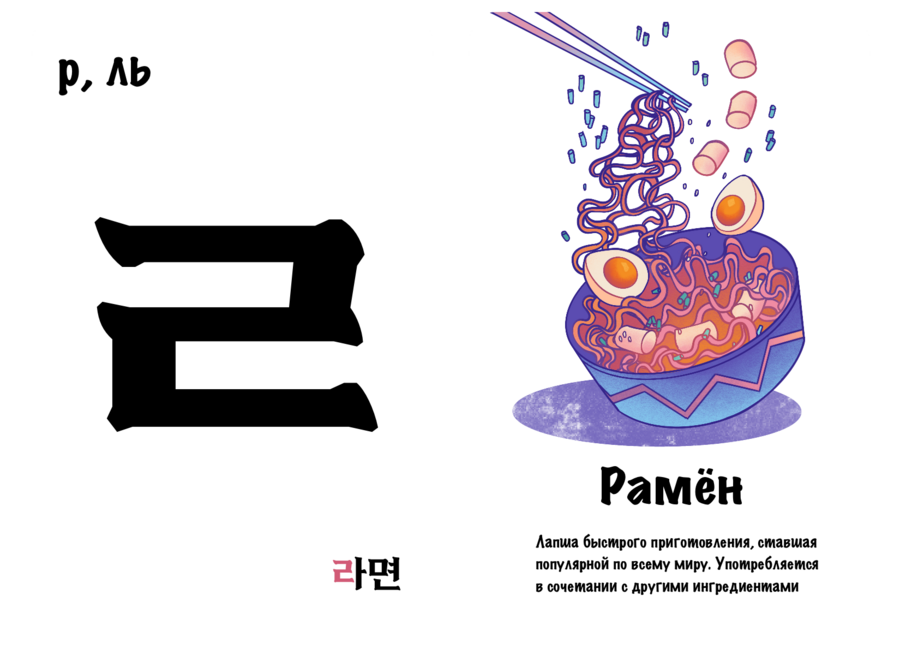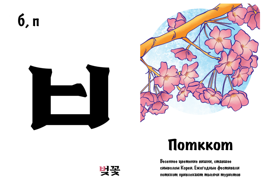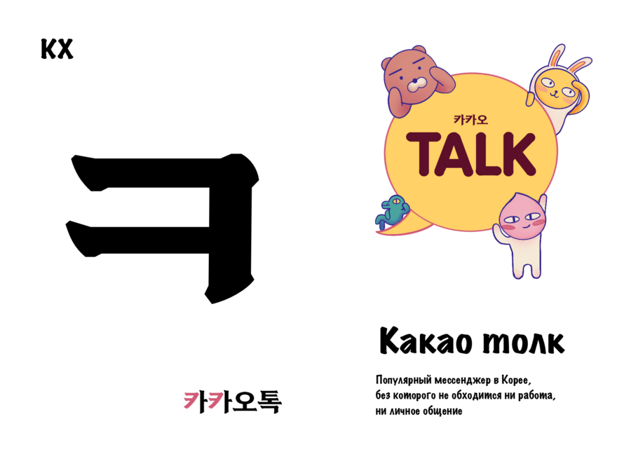 Проект «Культурный хангыль» нацелен на то, чтобы сделать изучение корейских согласных более интересным и полезным занятием. Он выполнен в виде двусторонних карточек, с одной стороны которых находится буква, а с другой — предмет / место или особенность, отсылающая к культуре Южной Кореи и начинающаяся на эту букву. Карточки станут хорошим дополнением к работе репетиторов и учителей корейского.