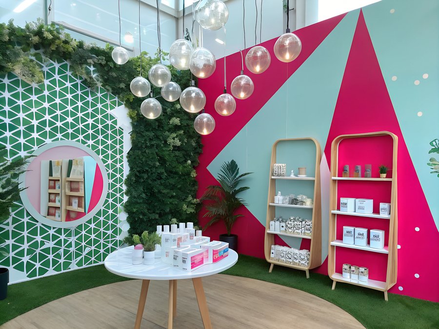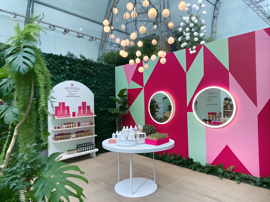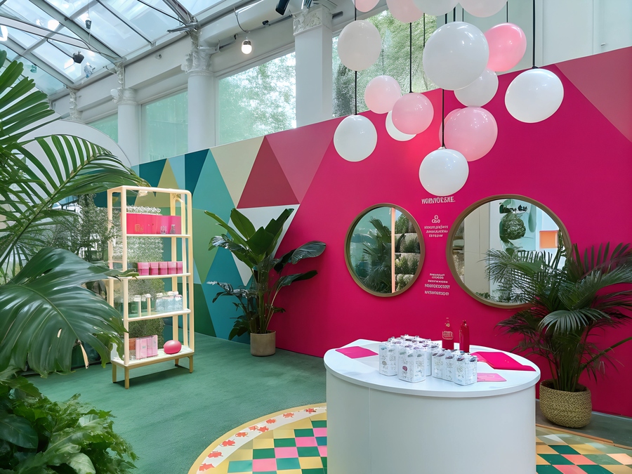 Промпт: «Create a pop-up store for a skin care brand with geometric illustrations on the walls, bubble clandeliers, mirrors with inflatable frames, plants. Skin care products placed on a round table in the middle of the store and shelves»