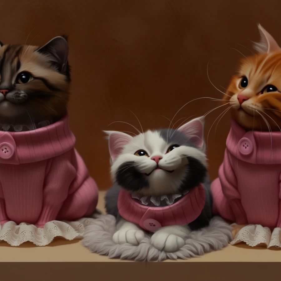 С помощью генерации в нейросетях были сделаны следующие изображения носителей товара. Промт к каждому изображению был таков: «Three adorable domesticated cats, each with unique fur patterns and bright curious eyes, sit together in a cozy arrangement, donning pink sweaters with slightly oversized buttons and delicate lace trim, their whiskers twitching with delight, against a warm, creamy beige background that complements the sweet, feminine hue of their stylish attire.»