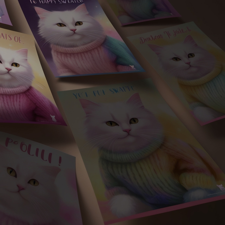 «A collection of vibrant posters, each featuring a serene white cat adorned with a cozy, pastel-hued sweater, set against a background that complements the feline’s gentle features, the cat’s bright eyes and delicate whiskers taking center stage, its fluffy fur and endearing expression inviting the viewer to pause and appreciate the warmth.»
