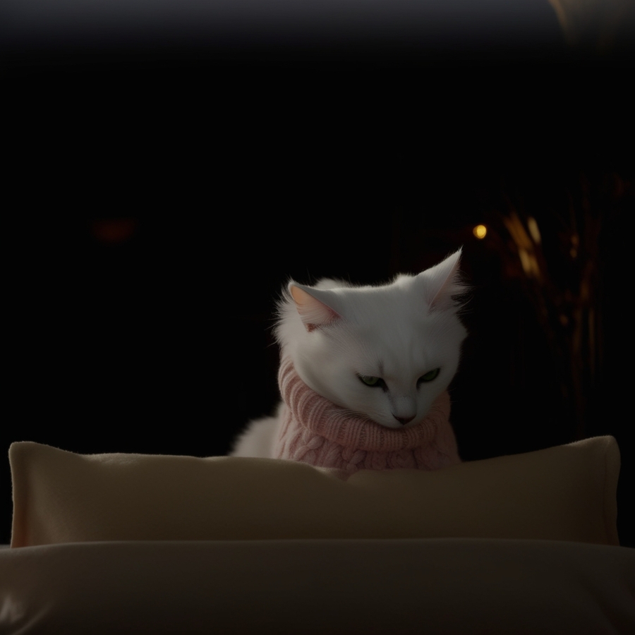 «А serene and contemplative white cat sitting alone on a soft cushion, wearing a warm and cozy pastel pink sweater with a subtle cable knit pattern, its fur a white with a slight sheen, its eyes cast downward in a gentle, introspective the surrounding atmosphere warm and cozy.»