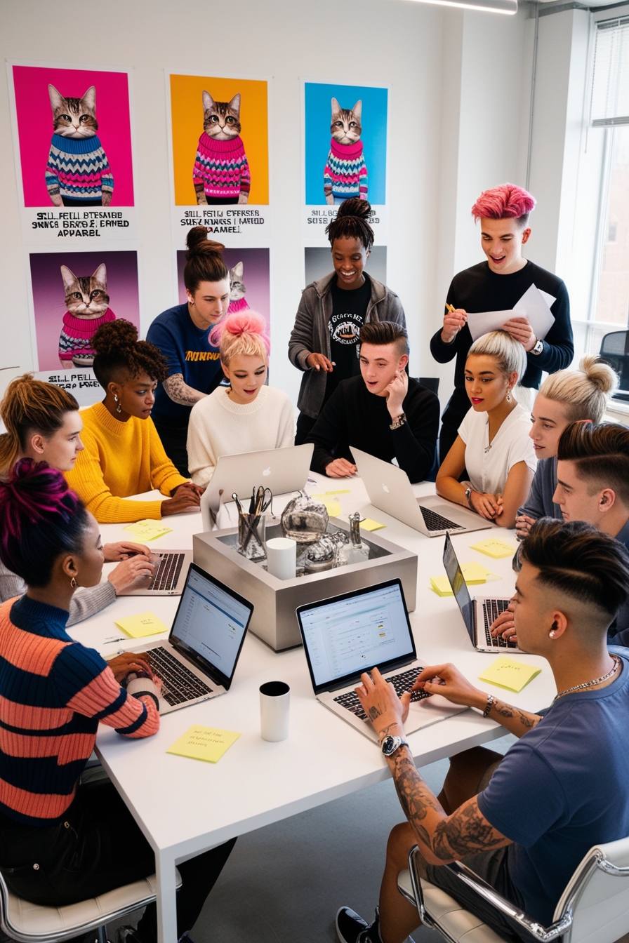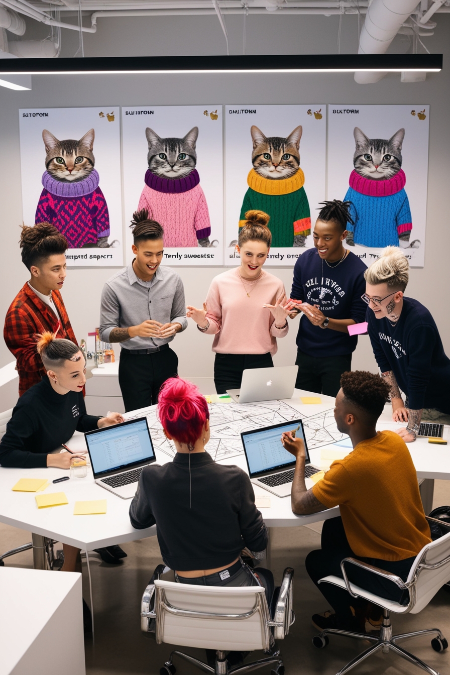 A modern startup office with a clutter-free trading platform as the central focus, surrounded by minimalistic white desks and sleek silver chairs, adorned with vibrant color posters featuring adorable cats wearing trendy sweaters, showcasing the innovative idea of selling feline-inspired apparel. A diverse group of young professionals, with varying skin tones and stylish haircuts, ranging from messy buns to stylish undercuts, gather around the platform, actively engaged in discussions, analyzing data on their laptops and scribbling notes on sticky notes, their facial expressions ranging from intense focus to amused curiosity. One individual, with bright pink hair and a sleeve of tattoos, enthusiastically gesticulates while explaining a concept, while another, with wire-rimmed glasses and a kind smile, attentively listens, taking notes. The room is bathed in a warm, natural light, with a subtle hint of creativity and entrepreneurship.