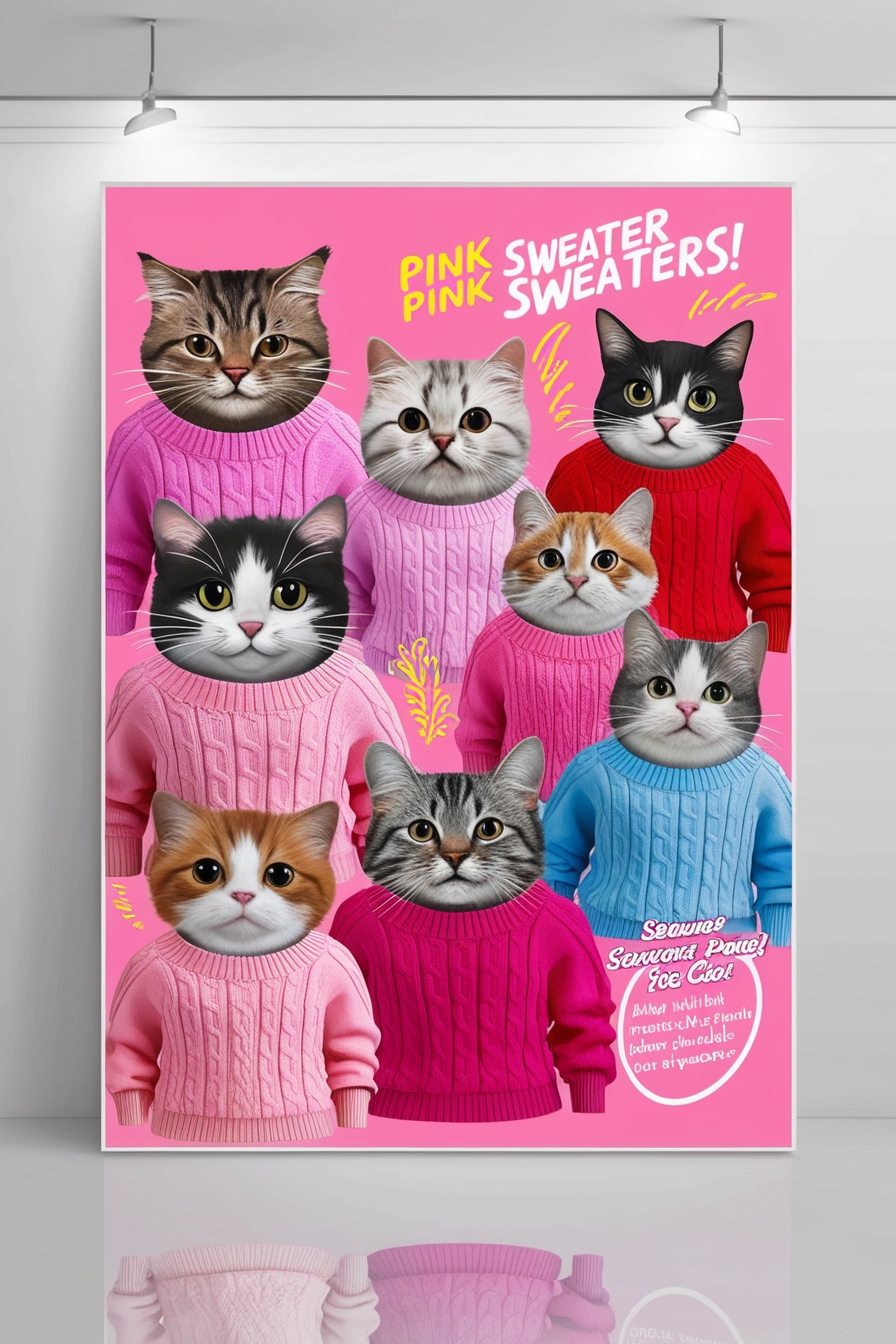 A vibrant and playful advertisement panel on a clean white background, showcasing a collection of pink sweaters with adorable cats seamlessly integrated into the design, as if they are wearing the sweaters, featuring a mix of realistic and cartoonish cat breeds with distinct fur textures and colors, whiskers, and expressive eyes, the sweaters themselves having varying shades of pink, from pastel to hot, with different textures and patterns, such as cable knit, crew neck, and V-neck, the overall mood of the image is lively.