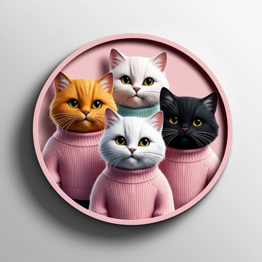 A highly detailed, ultra-high-resolution illustration of a round logo featuring three adorable cats, each wearing soft, pastel pink sweaters, with one orange, one white, and one black cat, all with distinct, vibrant fur textures, and endearing facial expressions, showcasing intricate whiskers and bright, shiny eyes, set against a clean, crisp background that allows the trio to take center stage, with bold, modern lines and subtle shading that adds depth and dimension to the design, exuding a warm, playful, and sophisticated aesthetic.
