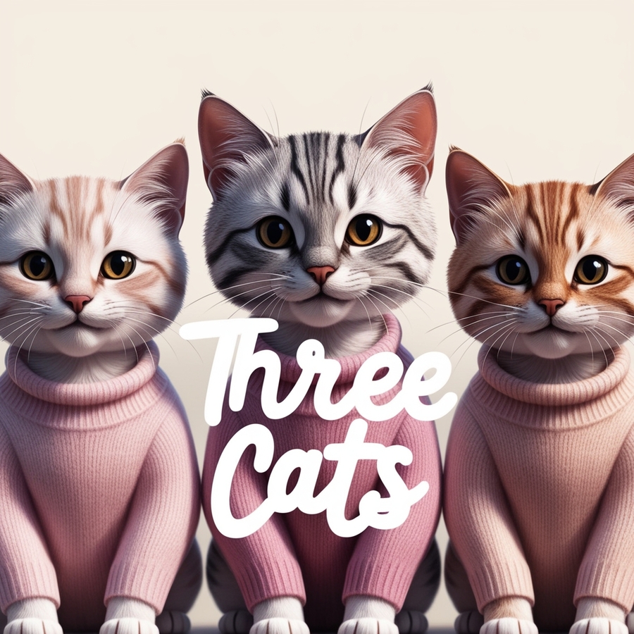 A highly detailed, ultra high-resolution illustration of three adorable cats, each wearing a soft, pastel pink sweater, with intricate textures and subtle shading, showcasing their unique personalities, with whiskers, bright eyes, and delicate features, set against a soft, creamy white background, with bold, playful font overlay stating «Three Cats» in a modern, handwritten script with rounded edges and a subtle gradient effect, evoking a sense of warmth, coziness, and friendship, with a touch of elegance and sophistication.
