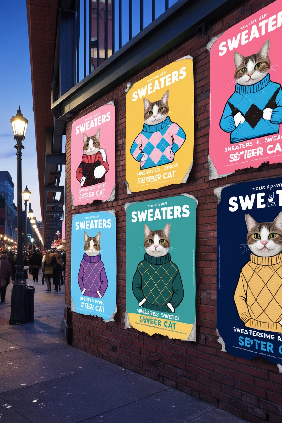 A vibrant city street scene at dusk, lined with lampposts and bustling with people, featuring a series of colorful advertising posters plastered on brick walls and steel beams, each showcasing a unique and quirky design that combines sweaters with adorable cats in humorous and unexpected ways, such as a cat peeking out of a argyle sweater pocket or wearing a cozy turtleneck, with bold fonts and playful graphics, in a mix of bright pastel colors like pink, blue, and yellow, as well as deeper tones like navy and green, with the posters' edges slightly worn and torn, as if they’ve been up for a while, adding a sense of urban grit to the overall aesthetic.